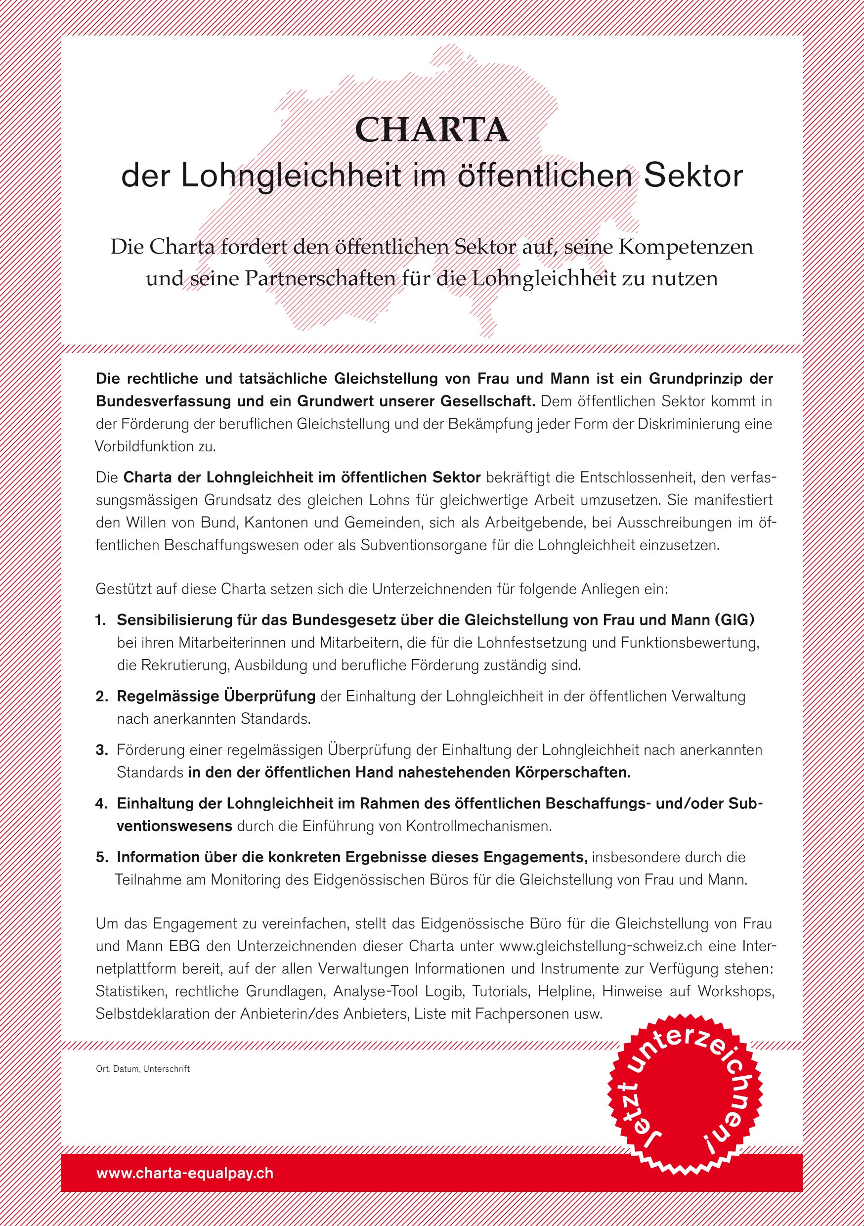 Am 21. Juni 2017 hat der Walliser Staatsrat beschlossen, die Charta der Lohngleichheit zu unterzeichnen. Bisher haben 13 Kantone, 29 Gemeinden und der Bund diese Charta unterzeichnet, gemäss der die Kantone eine Vorbildfunktion in der Förderung der Gleichstellung der Geschlechter einnehmen sollen.