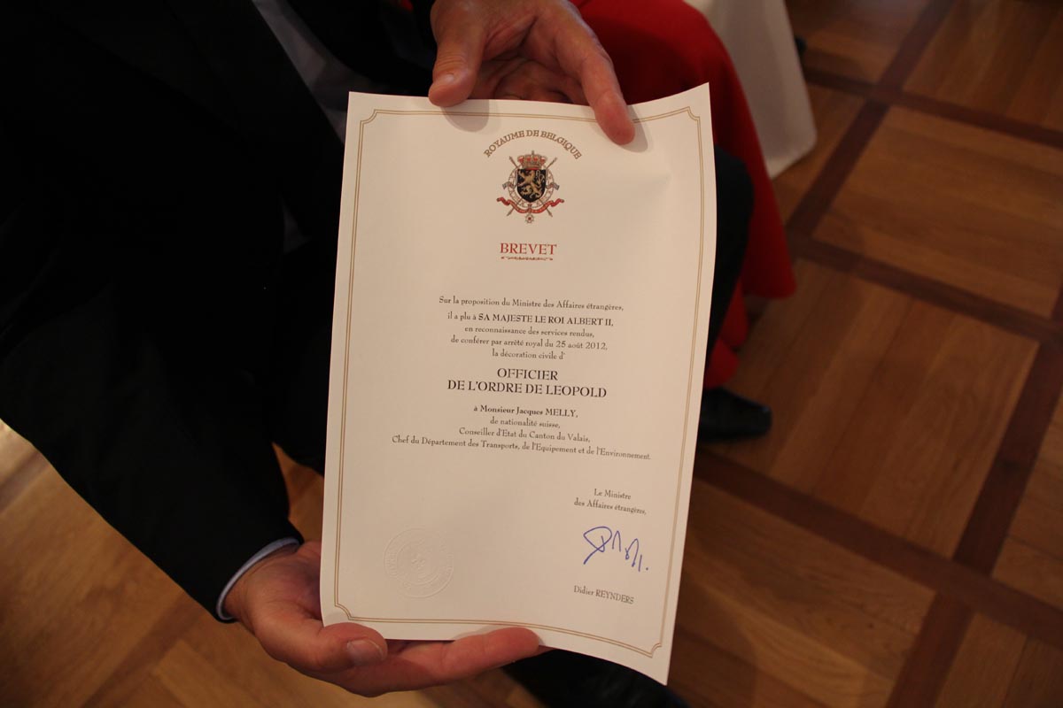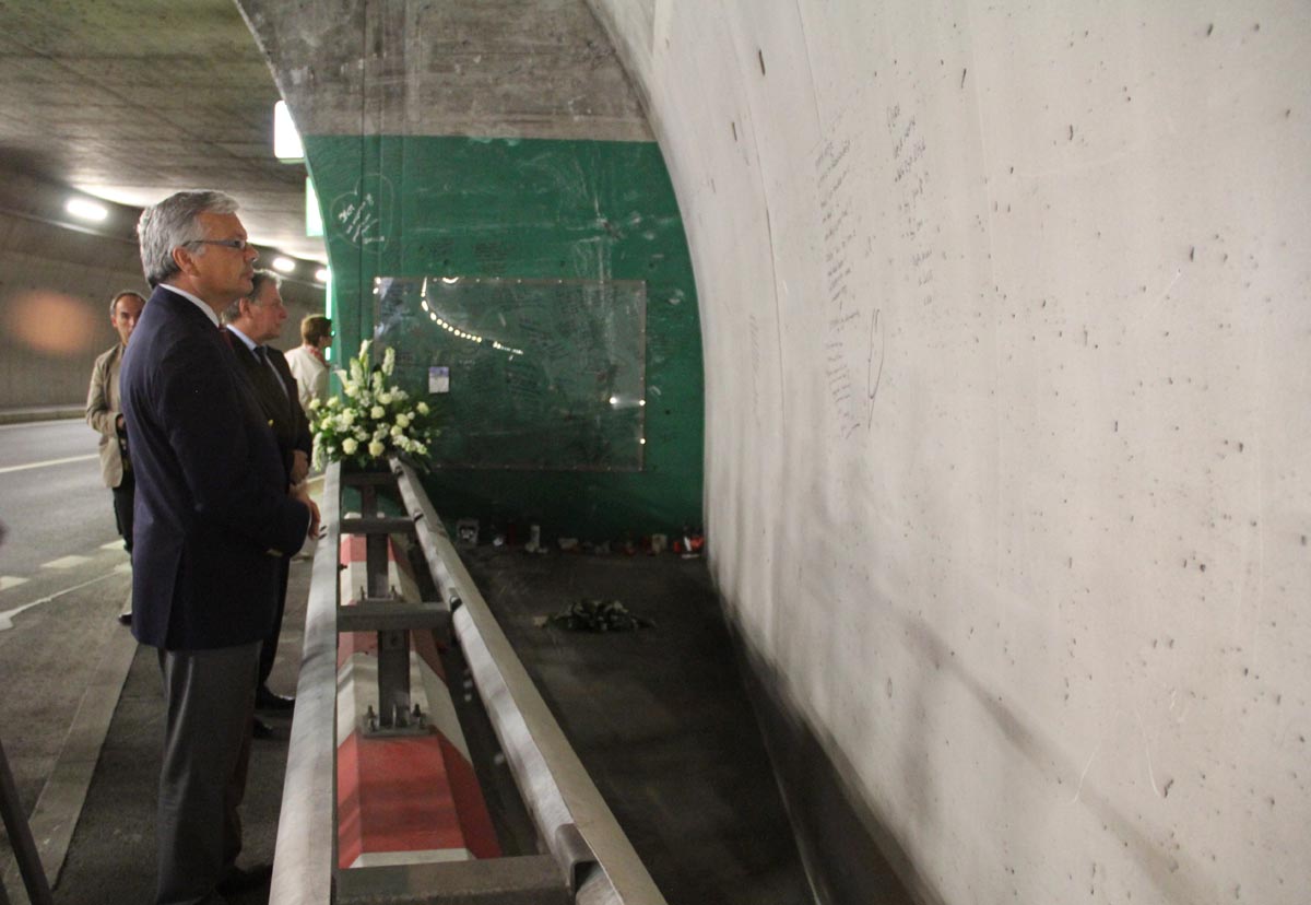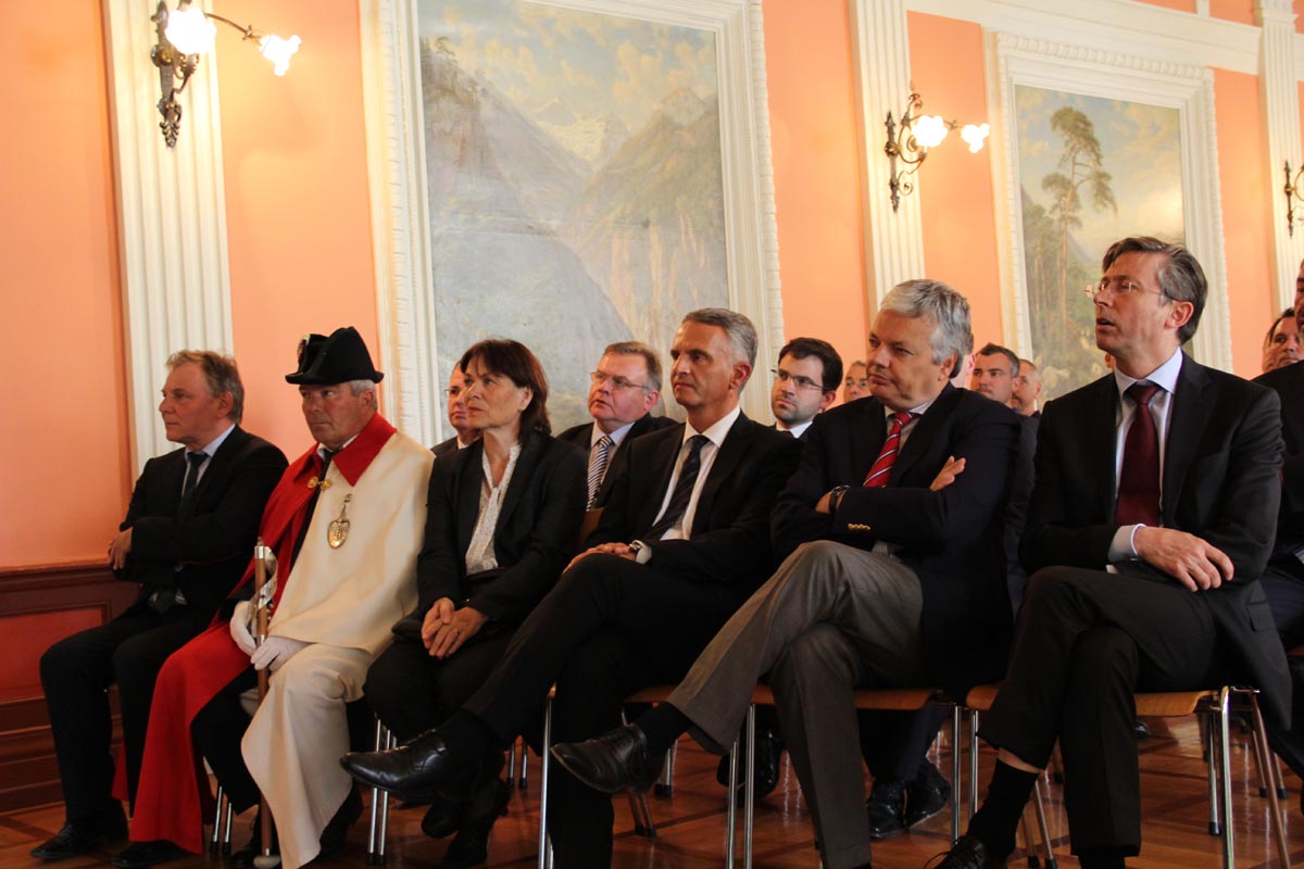 (IVS).- Didier Reynders, belgischer Vizepremierminister und Minister für auswärtige Angelegenheiten, für den Aussenhandel und europäische Angelegenheiten, begab sich am Montag nach Siders, um im A9-Tunnel der Opfer des Busunglücks vom 13. März 2012 zu gedenken. Anschliessend brachte er im Rathaus die Anerkennung seines Landes für die Schweiz und das Wallis zum Ausdruck. Die Präsidentin der Walliser Regierung, Esther Waeber-Kalbermatten, Staatsrat Jacques Melly, der Präsident der Stadt Siders, François Genoud und Vertreter der Rettungskräfte nahmen an der Zeremonie im Beisein von Bundesrat Didier Burkhalter teil.