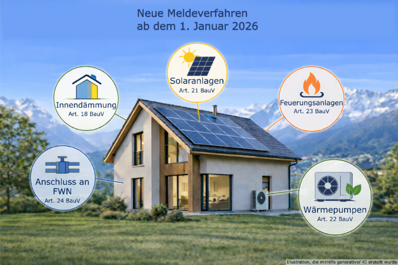 Das neue Baugesetz (BauG) und die dazugehörige Verordnung (BauV) sind am 1. Januar 2026 in Kraft getreten. Die neue Baugesetzgebung führt insbesondere neue Meldeverfahren anstelle von Baubewilligungsverfahren ein, sowie eine Meldepflicht für Wärmedämmarbeiten im Inneren des Gebäudes, wenn sich dieses in der Bauzone befindet.