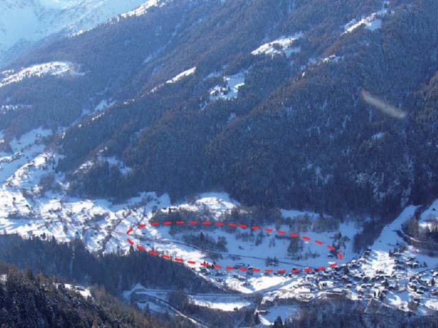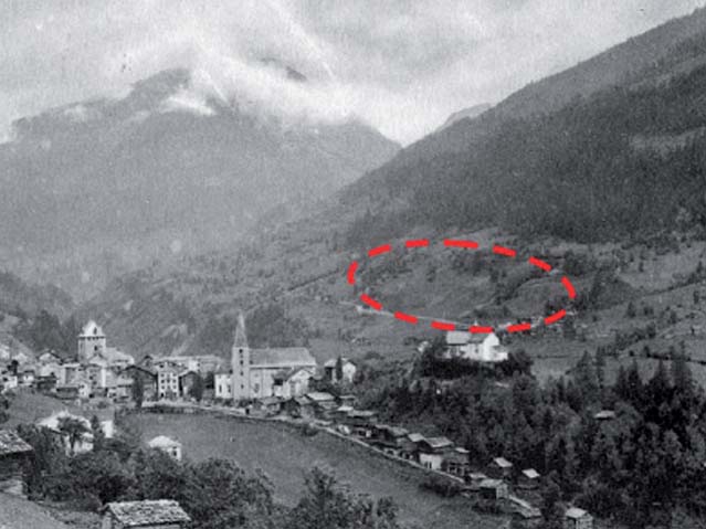 Vue du village de Vissoie et du périmètre du projet en arrière-plan (début du 20ème siècle).