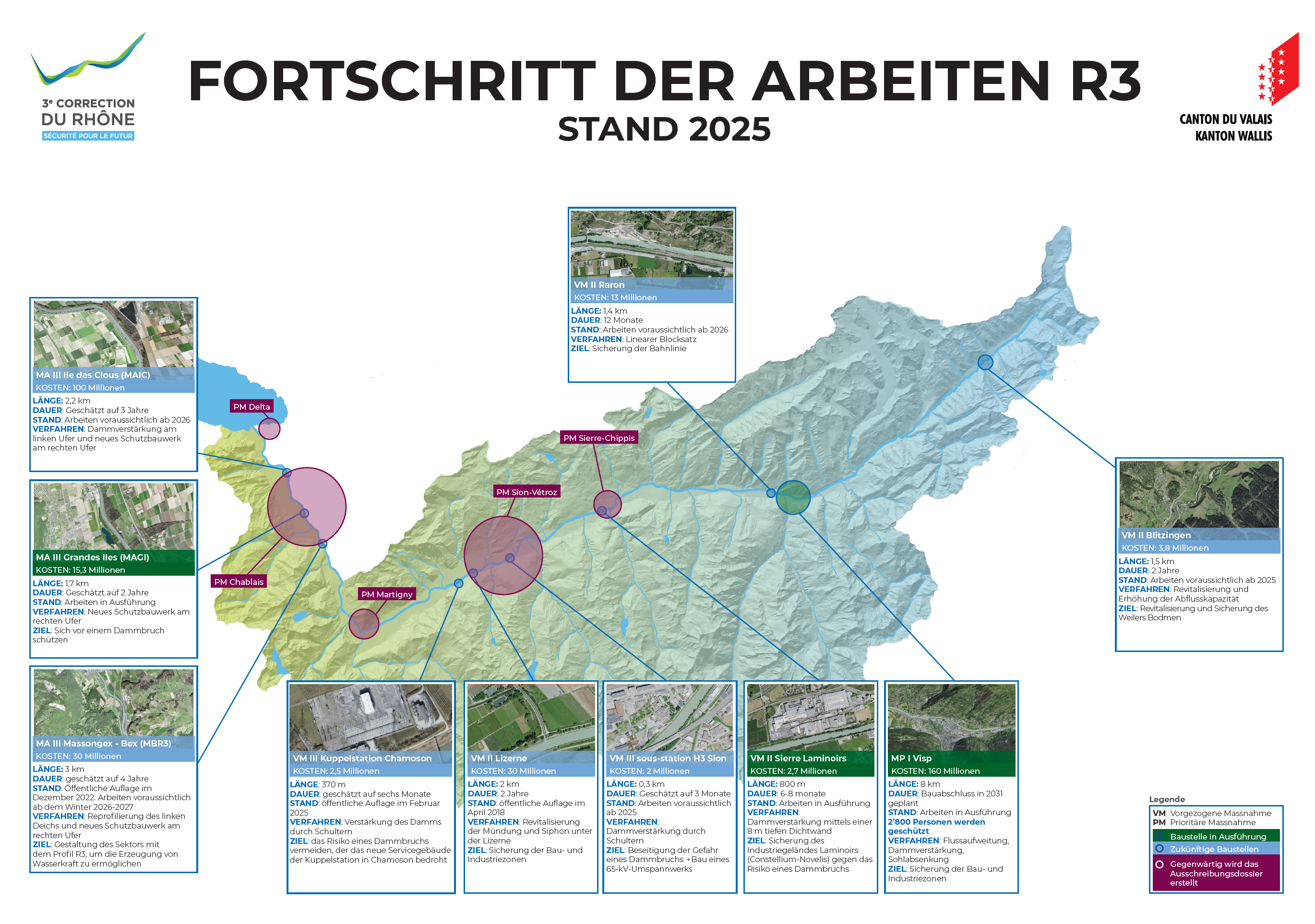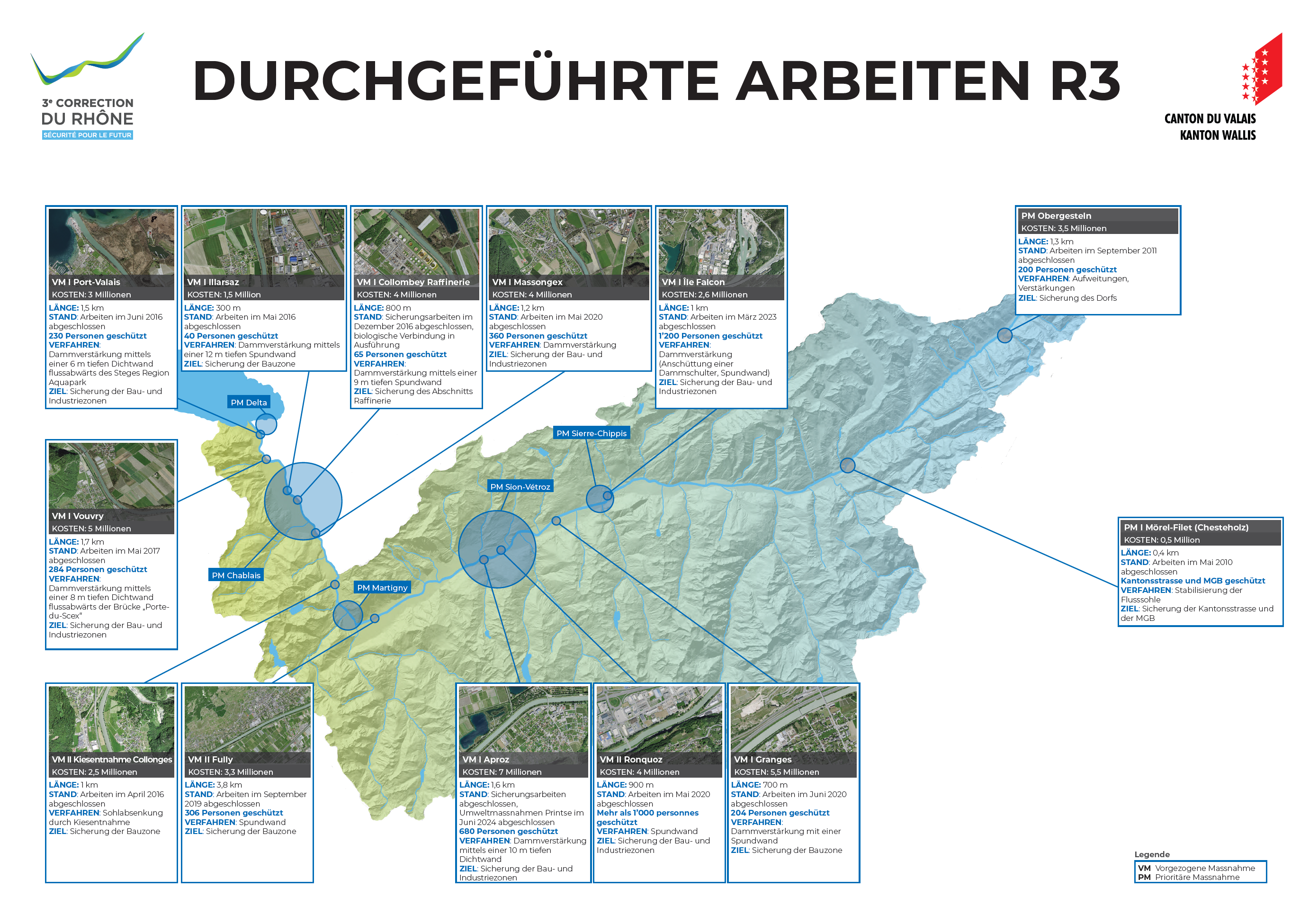 Die Bauarbeiten an der 3. Rhonekorrektion erfolgen in Etappen, gemäss den gesetzten Prioritäten. Daraus ergeben sich zwei Arten von Massnahmen: punktuelle (Vorgezogene Massnahmen) und globale (Prioritäre Massnahmen).
