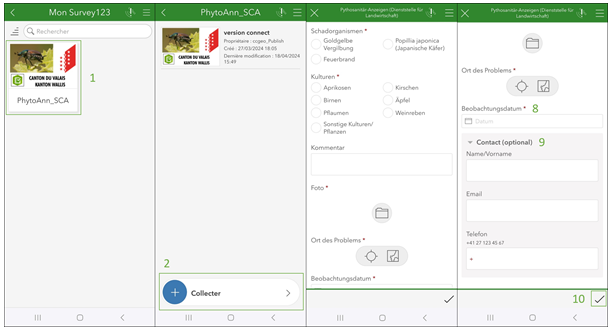 Sobald Sie die Anwendung heruntergeladen haben, ist das Formular immer verfügbar und muss nicht mehr heruntergeladen werden. Klicken Sie auf das Logo (1) in Ihrem Verzeichnis und dann auf "Sammeln" (2) (Abb. 3). Wählen Sie einen der verfügbaren Schadorganismen (3) und die Kultur aus, an der Sie den Organismus beobachtet haben (4). Fügen Sie einen Kommentar hinzu, wenn Sie weitere Angaben machen möchten (5). Bevor Sie das Formular ausfüllen, machen Sie ein Foto des Schadorganismus und fügen das Foto im Formular ein (4). Fügen Sie den Ort, an dem Sie den Schädling beobachtet haben, entweder durch manuelles Auswählen des Ortes auf der Karte oder durch Geolokalisierung (7), sowie das Datum der Beobachtung (8) hinzu. Wenn Sie möchten, können Sie Ihre persönlichen Daten hinterlassen (9). Dies ermöglicht es uns, Sie im Falle von Zugangsproblemen zu kontaktieren. Um das Formular abzuschliessen, klicken Sie unten rechts auf das markierte Symbol (10).