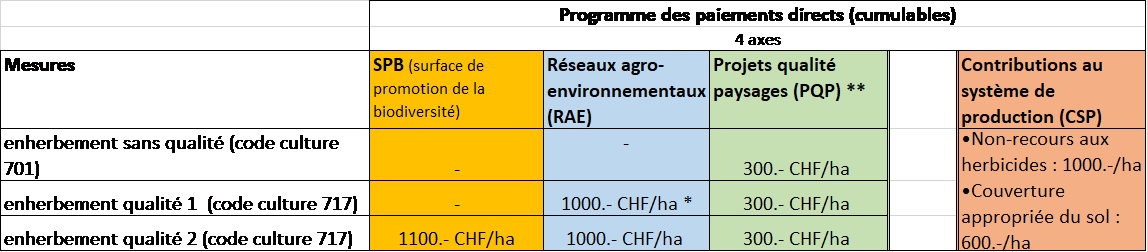 - Eine begrünte Parzelle kann von einem Beitrag von 300 CHF / ha mit LQP profitieren (dies hängt von den Projekten der Region ab)