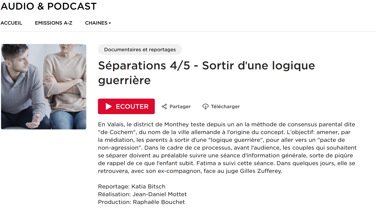 - Accompagner la séparation sans confrontation (Reiso.org, 21.04.2022, Laure Clivaz Strehmel, médiatrice FSM, Veyras) (Externer Link)