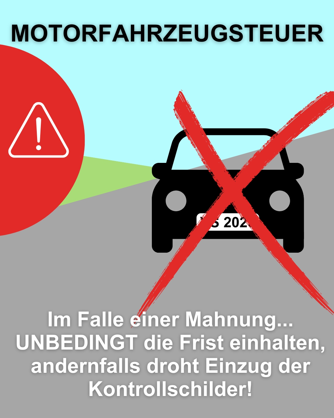 Die Rechnungen für die jährliche Motorfahrzeugsteuer wurden im Verlauf des Monats Dezember 2024 mit einer Fälligkeit per 31. Januar 2024 versandt. Allen Personen, die bis zu diesem Datum den fälligen Betrag noch nicht bezahlt haben, wird eine Mahnung zugestellt. Sollte die Zahlung bis zum Fälligkeitsdatum der Mahnung noch nicht erfolgt sein, verfügt die Dienststelle für Strassenverkehr und Schifffahrt (DSUS), in Anwendung der Artikel 16 des SVG und 106 der VZV, den Entzug des Fahrzeugausweises sowie der Kontrollschilder des betroffenen Fahrzeugs. Die Verfahrenskosten gehen zu Lasten des Fahrzeughalters.