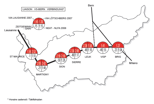 Die Strecke Visp - Bern in weniger als einer Stunde ermöglicht die Einbindung und den Anschluss des Wallis an die Hauptanschlussknoten des schweizerischen Stundentakts, besonders diejenigen von Bern, Basel, Olten und Zürich.