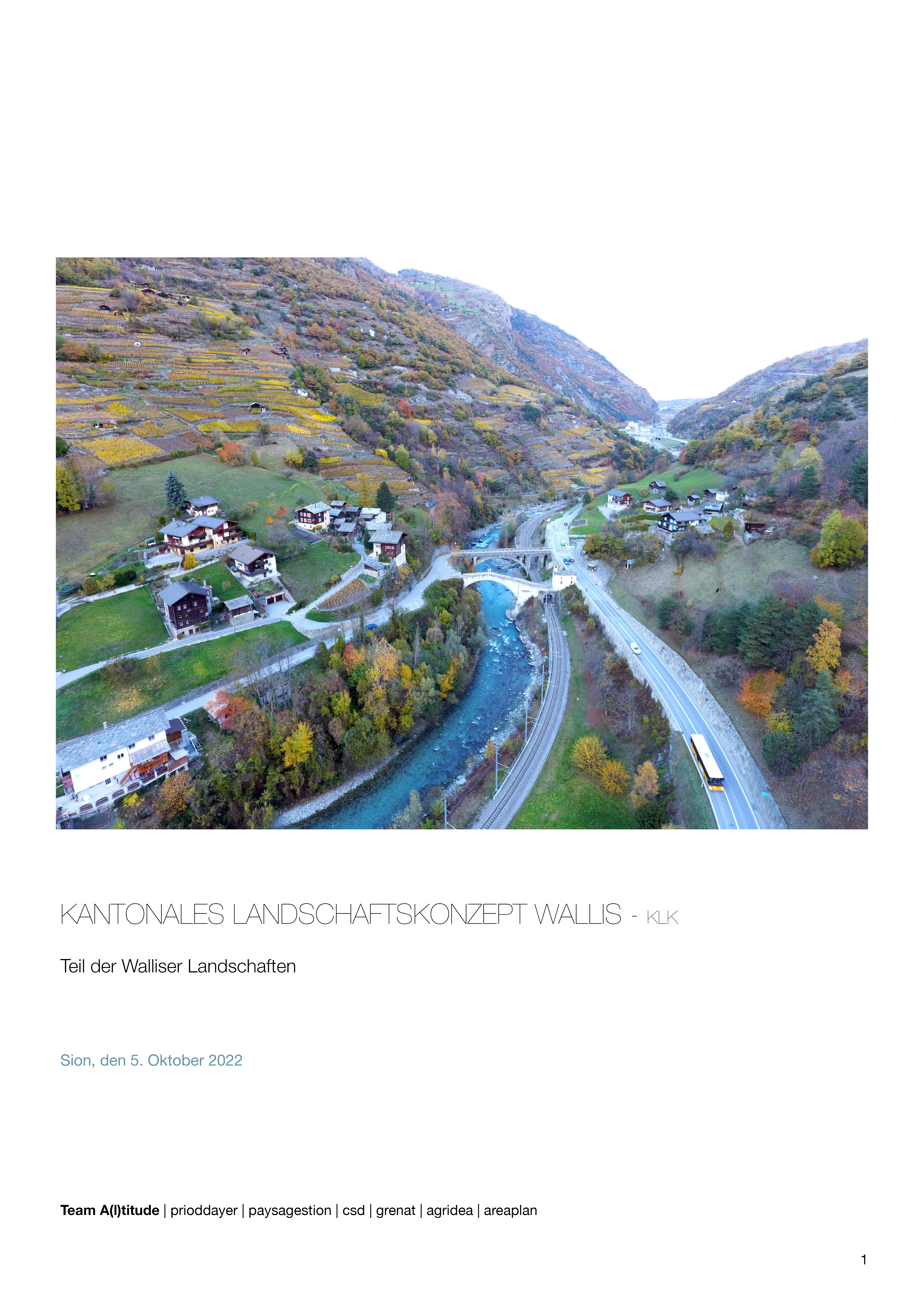 Das kLK ist eine Grundlagenstudie im Sinne von Art. 6 RPG und Art. 4 kRPG. Es stellt eine umfassende Vision der Landschaft dar, die es ermöglicht, die verschiedenen Aktivitäten des Kantons, die sich auf die Landschaft auswirken, zu koordinieren. Die Prioritäten und Aufgaben des Kantons, die sich teilweise auch auf Gemeindeebene auswirken werden, müssen in einem Aktionsplan und im kantonalen Richtplan präzisiert werden. Das kantonale Landschaftskonzept gliedert sich in zwei Hauptdokumente, der Allgemeine Teil und der Teil des Walliser Landschaften, sowie ein Zusatzdokument, der Teil der Begehungen.