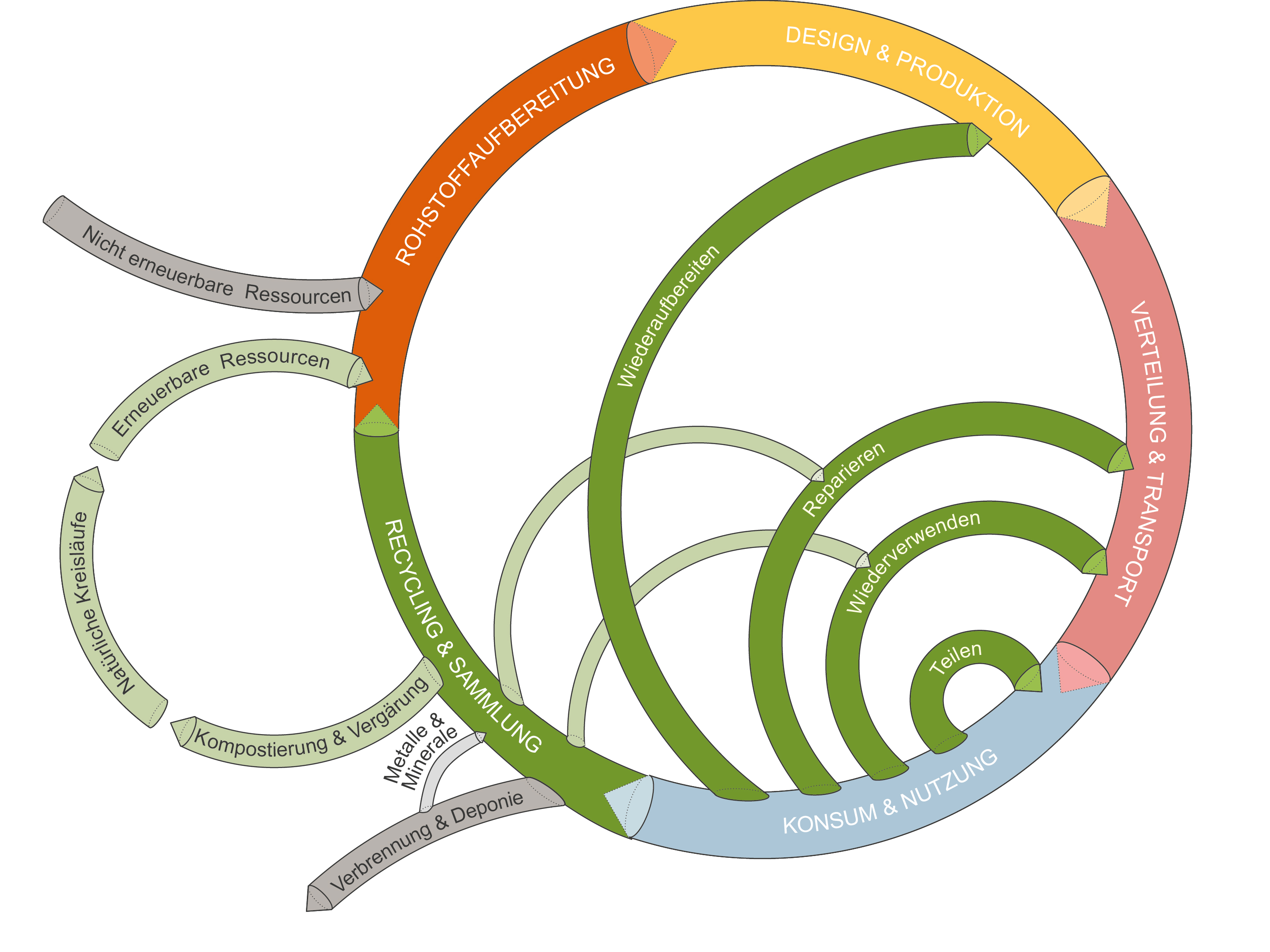 Die Kreislaufwirtschaft widerspricht diesem Prinzip, da sie darauf abzielt, Produkte und Ressourcen wieder in den Kreislauf zurückzuführen. Anstatt wegzuwerfen, reparieren, verkaufen, wiederverwenden, renovieren wir ... Recycling und Entsorgung kommen erst als letztes Mittel zum Einsatz. Sie berücksichtigt auch im Vorfeld den gesamten Lebenszyklus eines Gegenstands, um ein umweltfreundliches Design zu erreichen, das Ressourcen spart, Gegenstände und Materialien langlebiger macht und wiederholt verwendet und wieder in den Kreislauf zurückgeführt werden können.