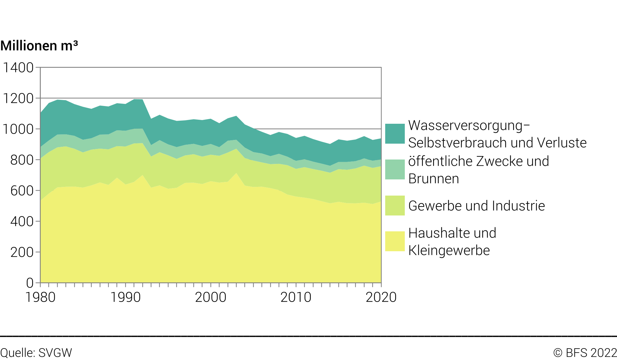 Verbrauch durch Haushalte und Kleingewerbe; Gewerbe und Industrie; öffentlichen Zwecke und Brunnen; Selbstverbrauch der Wasserversorgungsbetriebe und Verluste Wassernutzung. Quelle: Schweizerischer Verein des Gas- und Wasserfaches (SVGW). Publikation: 16.06.2022. © BFS 2022