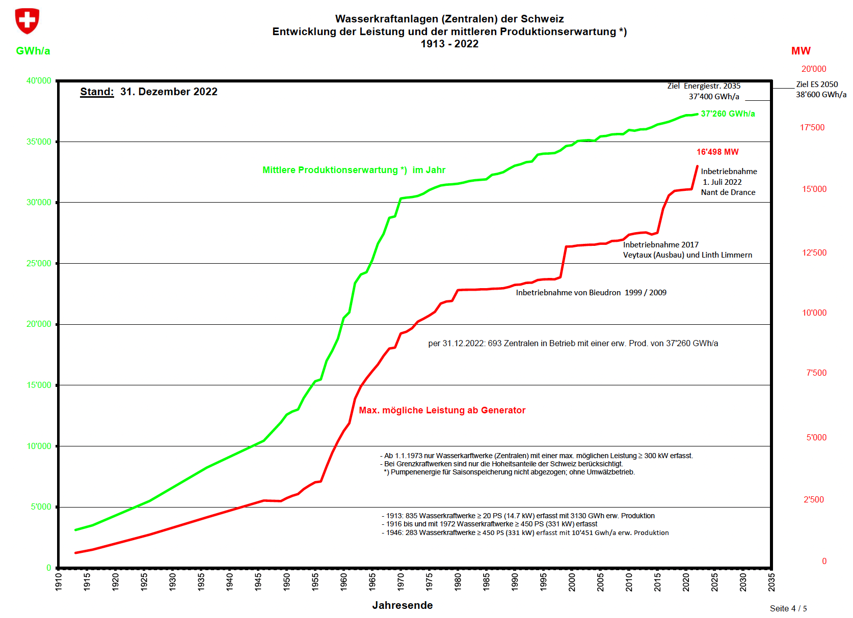 Wasserkraftanlagen der Schweiz – Entwicklung der Produktion von 1913 bis 2022. Quelle: bfe.admin.ch.