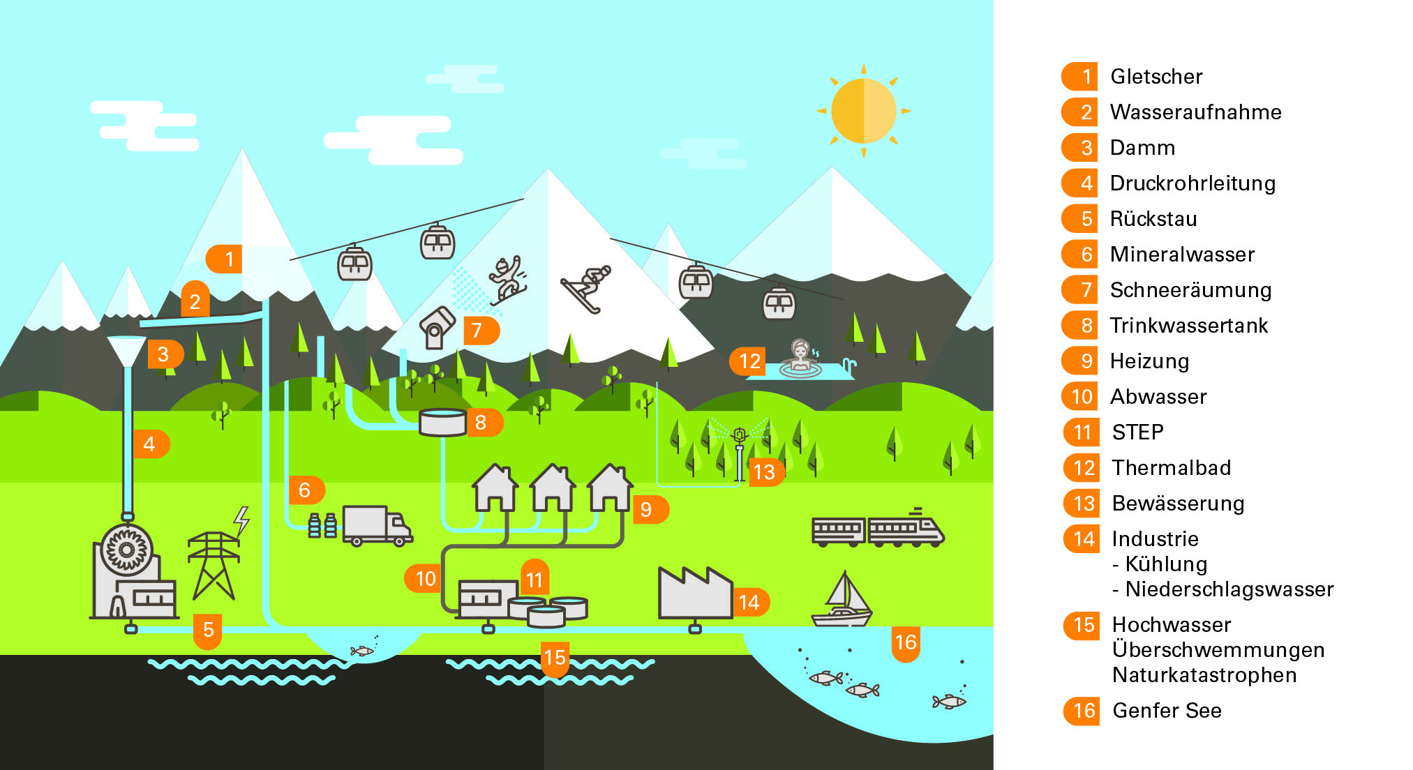 - Wasser nutzen. Wasser spielt eine wichtige Rolle in der Landwirtschaft, im Haushalt, im Tourismus, in der Industrie sowie im Bereich der erneuerbaren Energien (durch die Nutzung von Wasserkraft und Grundwasserwärme).