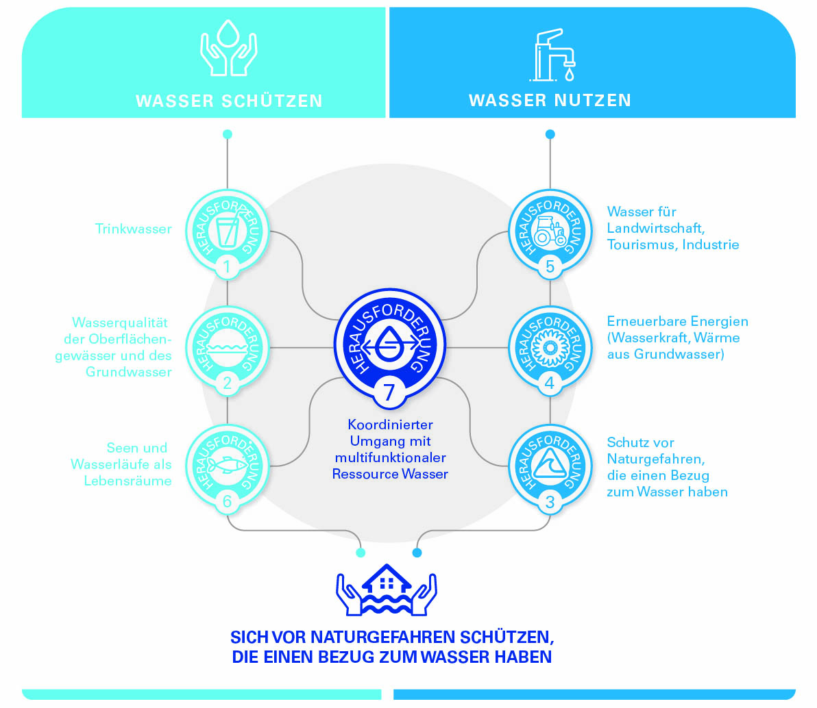 - Vorkehrungen treffen, um den Lebensraum der Menschen vor den Naturgefahren zu schützen, welche einen Bezug zum Wasser haben