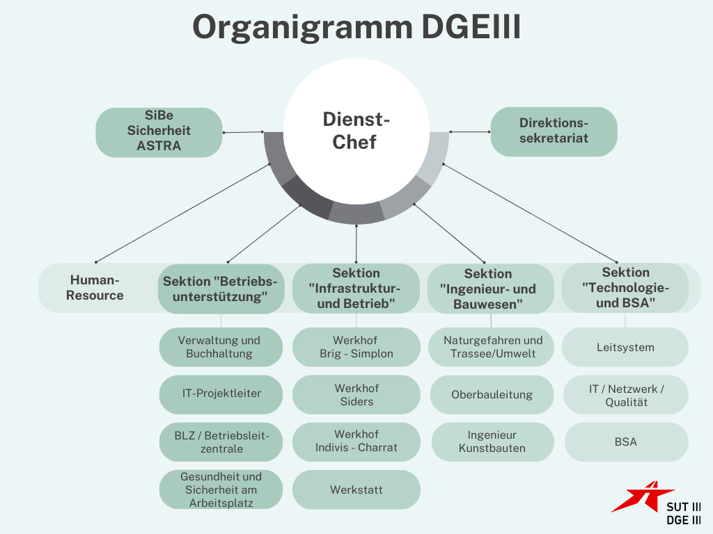 Ihre Tätigkeiten werden über eine Leistungsvereinbarung vollständig vom Bundesamt für Strassen (ASTRA) finanziert. Die Direktion der Dienststelle ist in Martigny stationiert. Die DGE III besteht aus vier Sektionen: