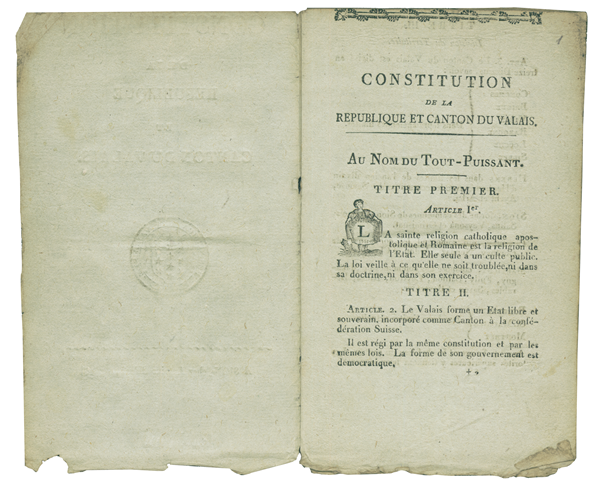 Die Walliser Gesetzessammlung wird mit der Verfassung vom 30. August 1802 eröffnet. Dieser war 1798 eine Verfassung vorausgegangen, die dem vom französischen Direktorium auferlegten Modell nachempfunden war. Das Volk war vom öffentlichen Leben ausgeschlossen und übte seine Rechte nur durch seine Vertreter aus. Diese Verfassung war allerdings nur von kurzer Dauer, da das Wallis bereits im selben Jahr mit der Helvetischen Republik vereinigt wurde.