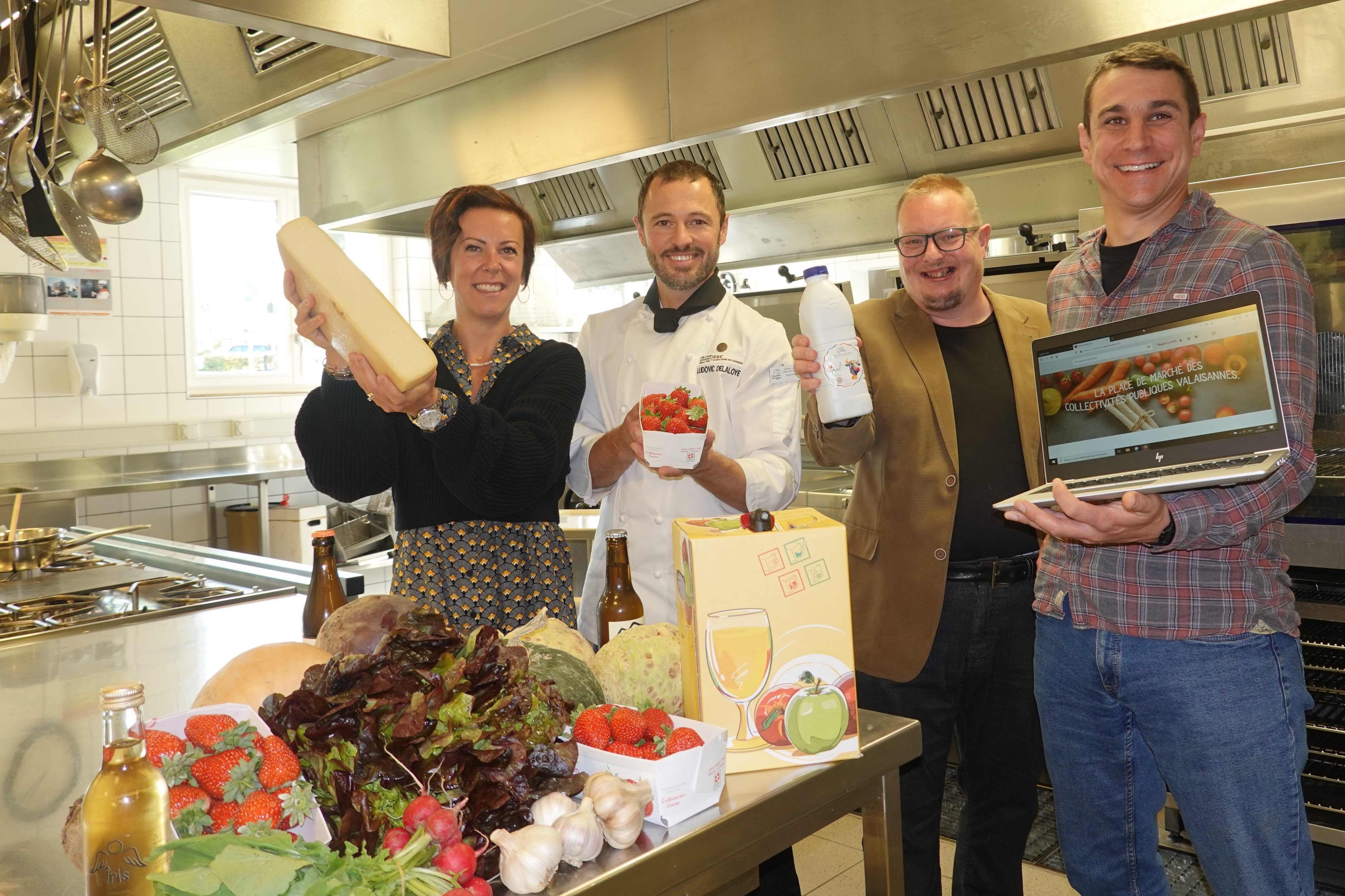 Sur la photo de gauche à droite: Christelle Dayer, coordinatrice Fourchette verte Valais, Ludovic Delaloye, responsable restauration, produits régionaux et innovation, Gilles Fragnière, cuisinier conseil Fourchette verte Valais et Grégory Liand, directeur Apcom solutions.