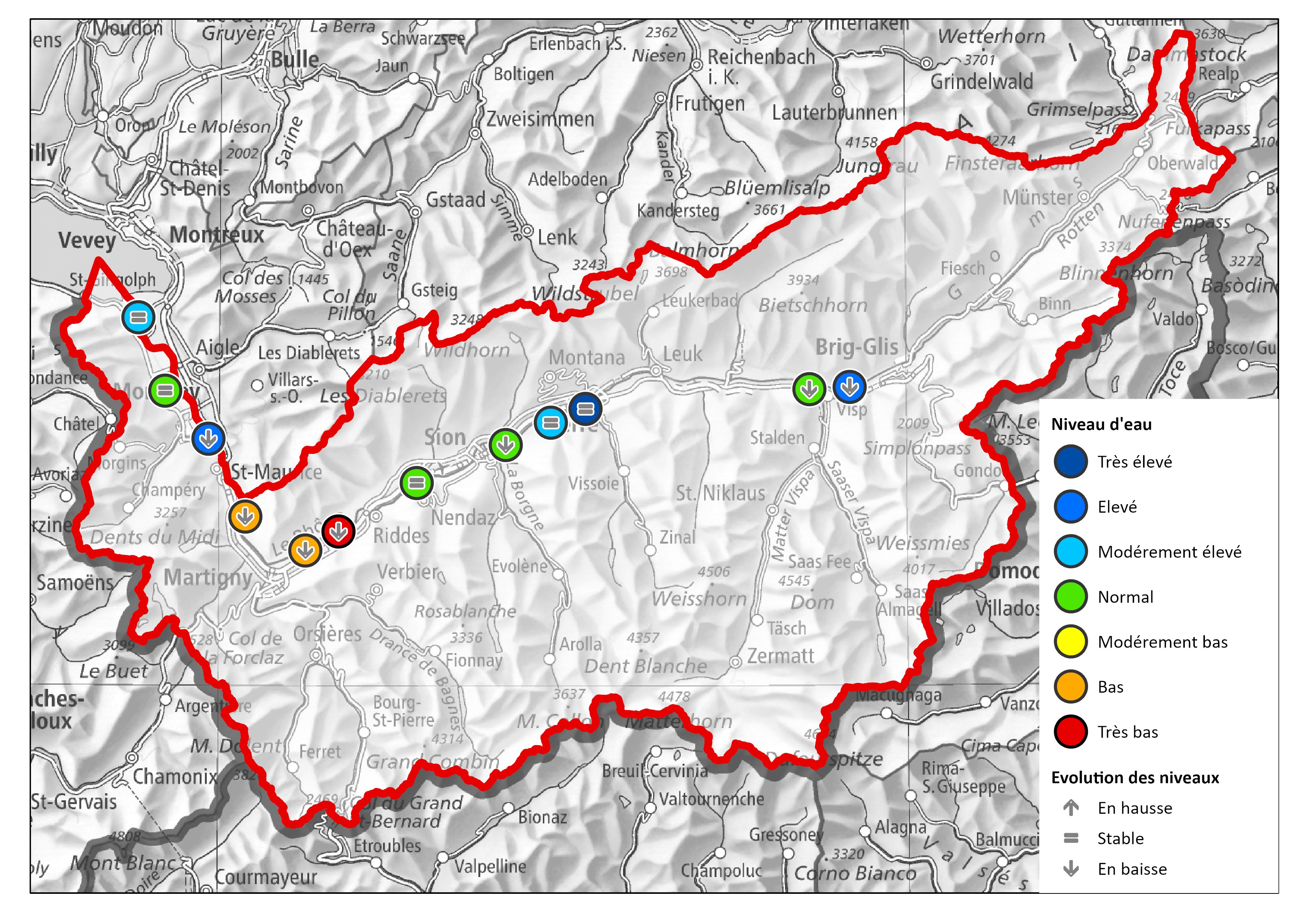 - Région Haut-Valais : Niveaux de nappe supérieurs ou égaux à la normale et tendance à la baisse.