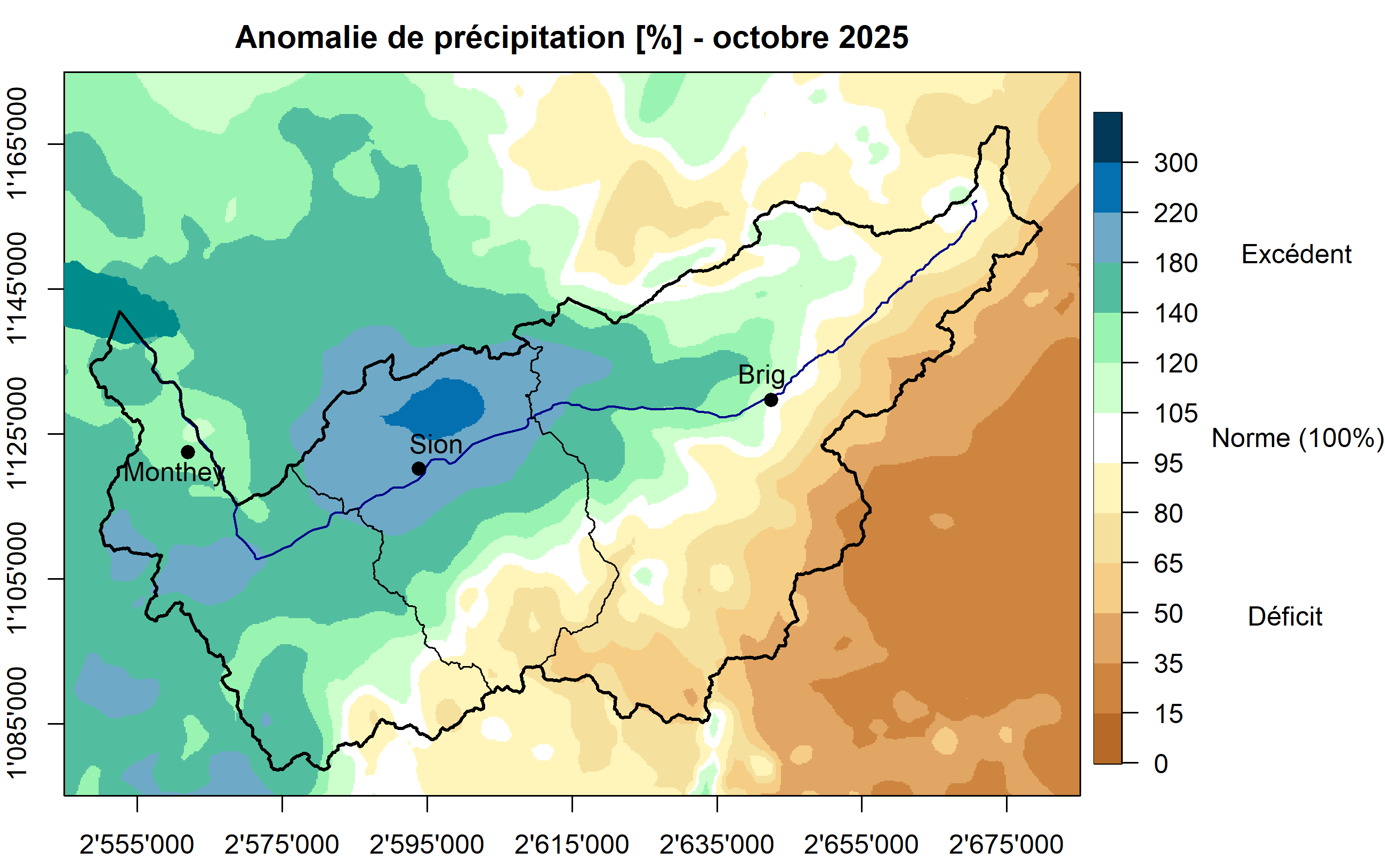 Figure 2: Anomalie mensuelle de précipitations pour octobre 2025 exprimée en % par rapport à la période de référence 2010-2024. Source : MétéoSuisse/CREALP.