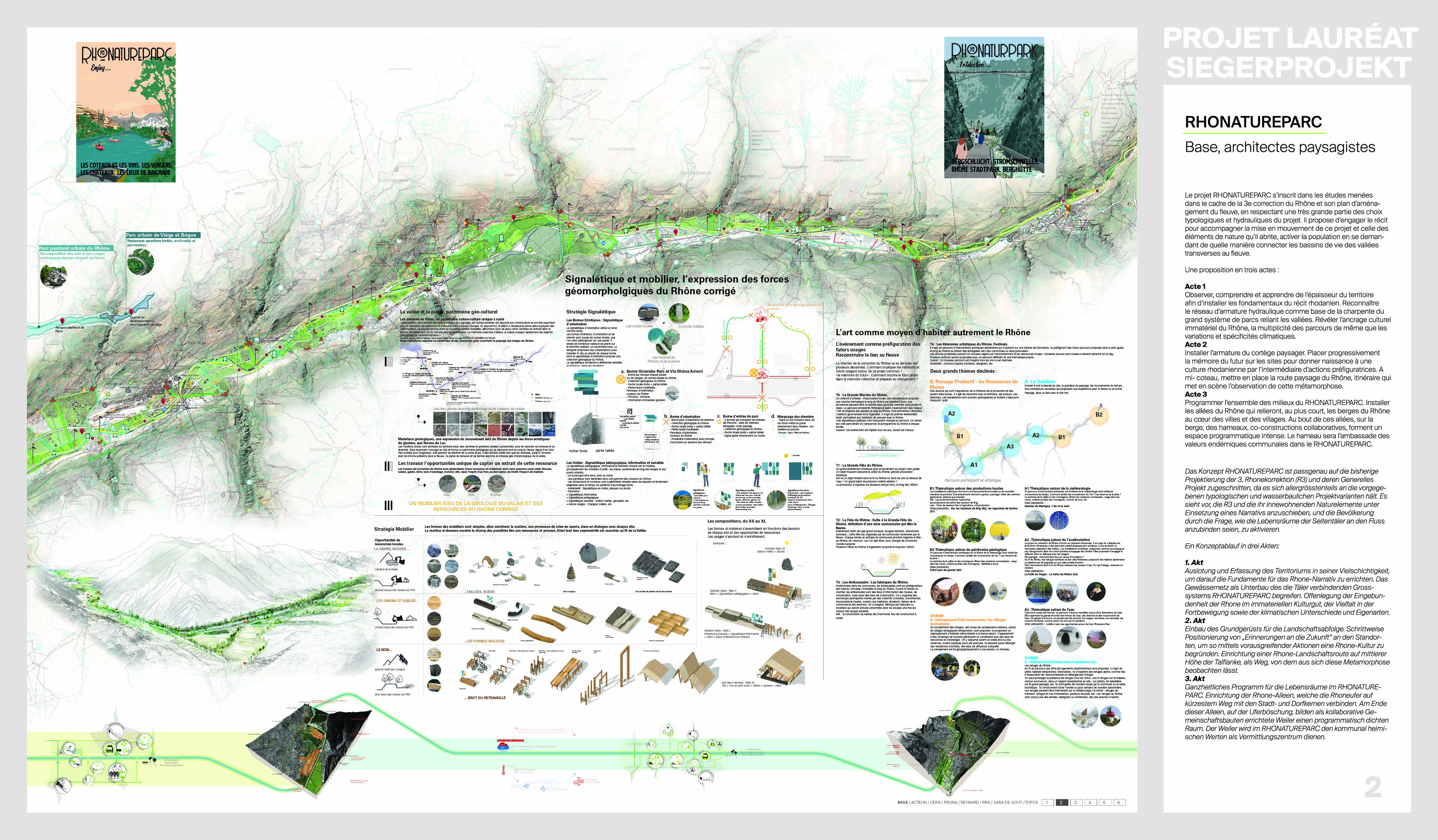 Un an jour pour jour après son lancement en décembre 2018, le concours international d’aménagement des espaces publics de la 3e correction du Rhône s’est terminé par la publication des résultats et une exposition des projets remis aux Arsenaux de Sion. C’était le 3 décembre 2019. Le groupement lauréat, emmené par l’agence Base de Lyon, a été désigné à l’unanimité du collège d’experts. Il a convaincu le jury en intégrant les éléments déjà arrêtés dans le cadre de la 3e correction du Rhône. Il a également démontré sa sensibilité à l’identité valaisanne et du Chablais vaudois. De plus, ses propositions concrètes d’espaces publics permettront de renouer le lien entre la population et le fleuve.