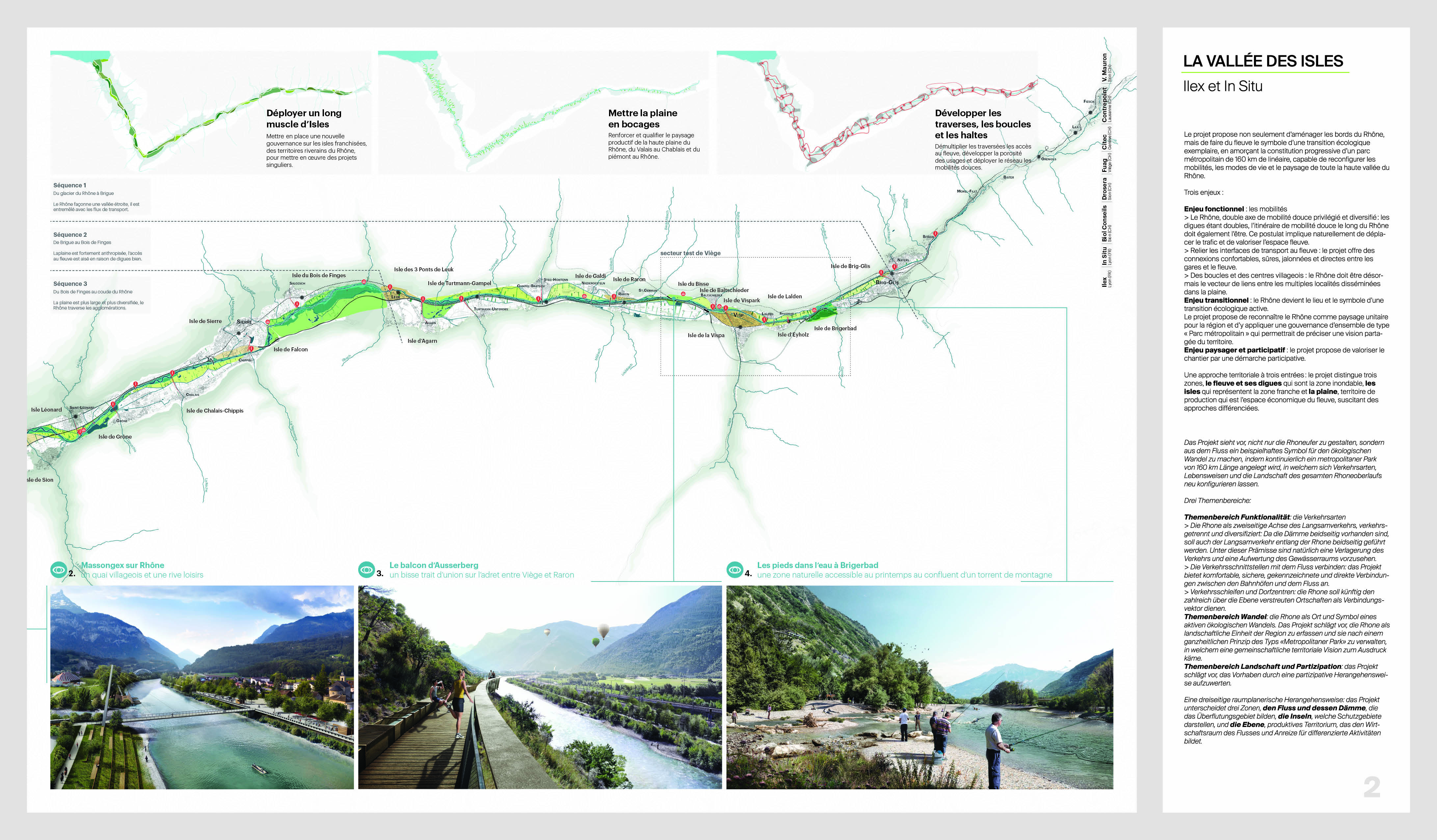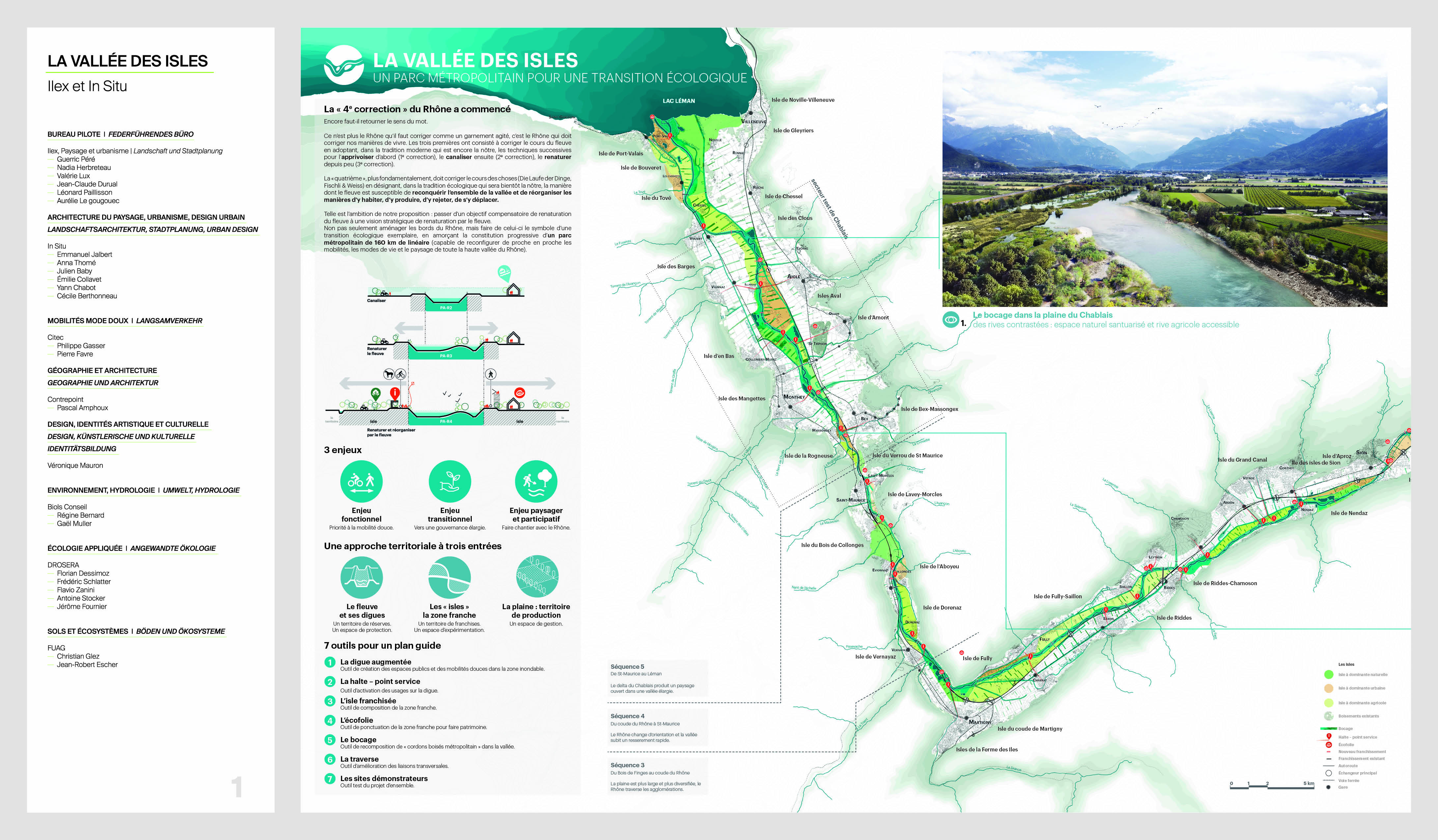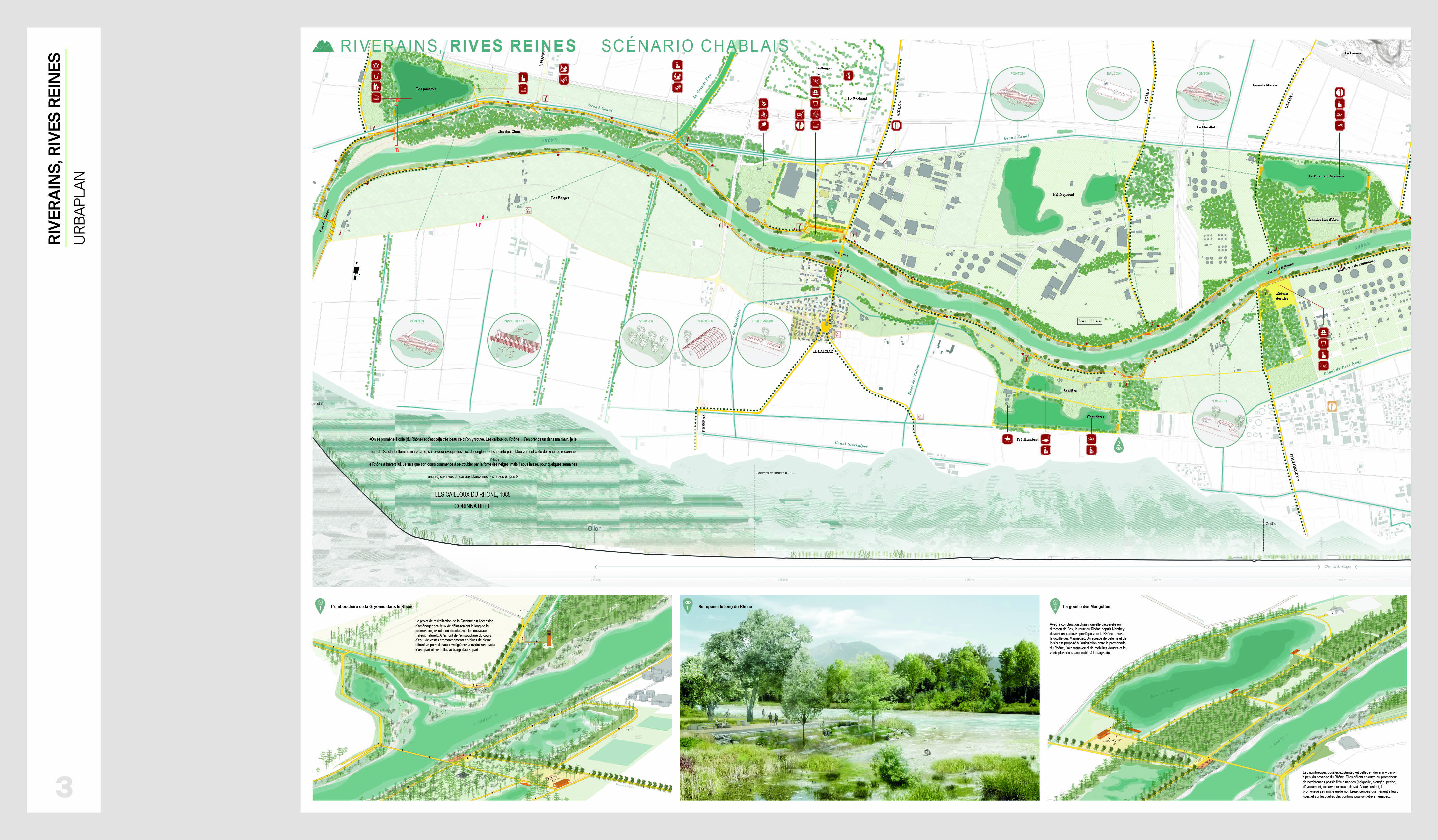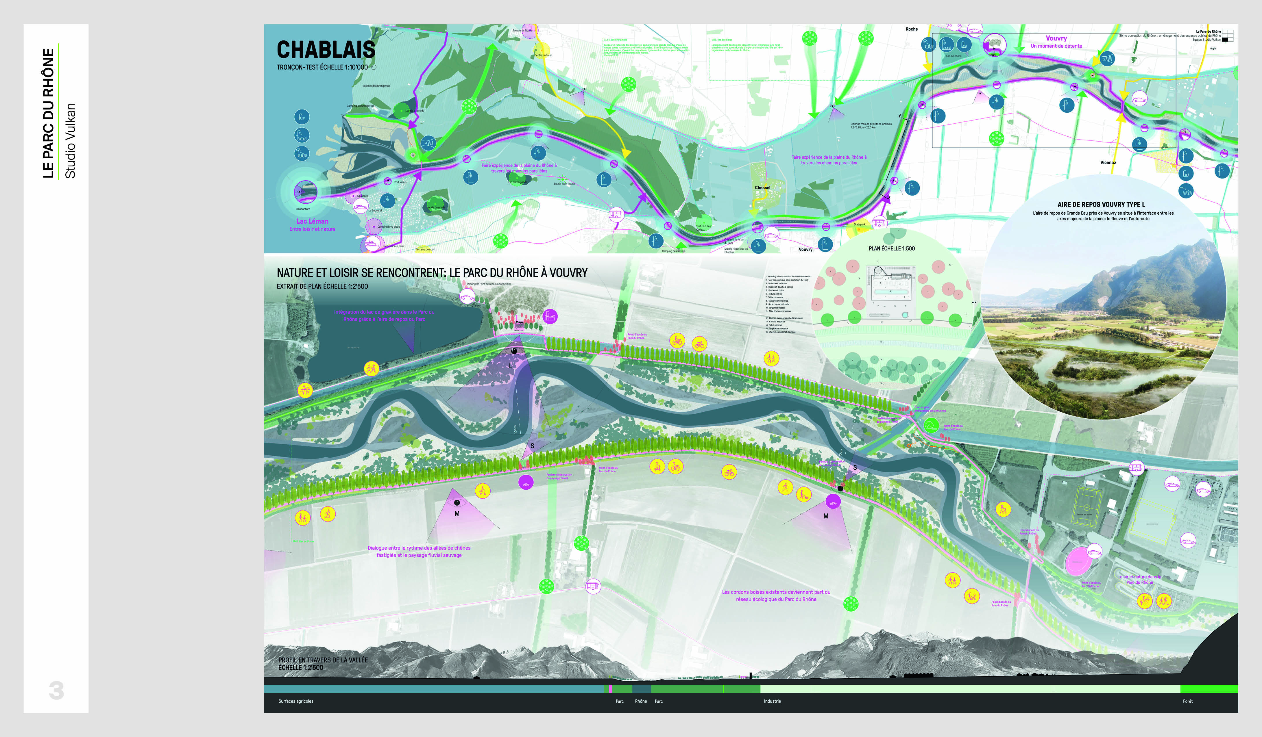 La vision paysagère proposée dépasse le cadre de la 3e correction du Rhône en intégrant des aménagements dans la plaine ainsi que sur les bords du fleuve.