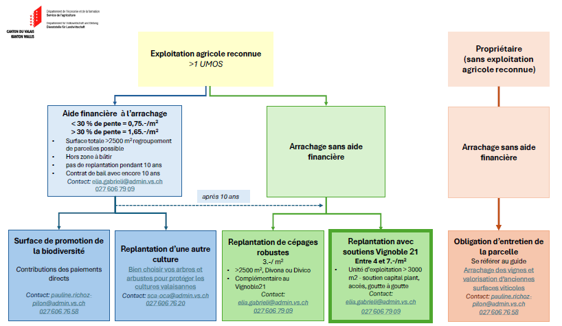 Dans le cadre de la modification du 25 février 2026 de l’Ordonnance fédérale sur les améliorations structurelles dans l'agriculture (OAS) et en particulier de son annexe 6, la Confédération met en place un programme de soutien à l’arrachage des vignes.