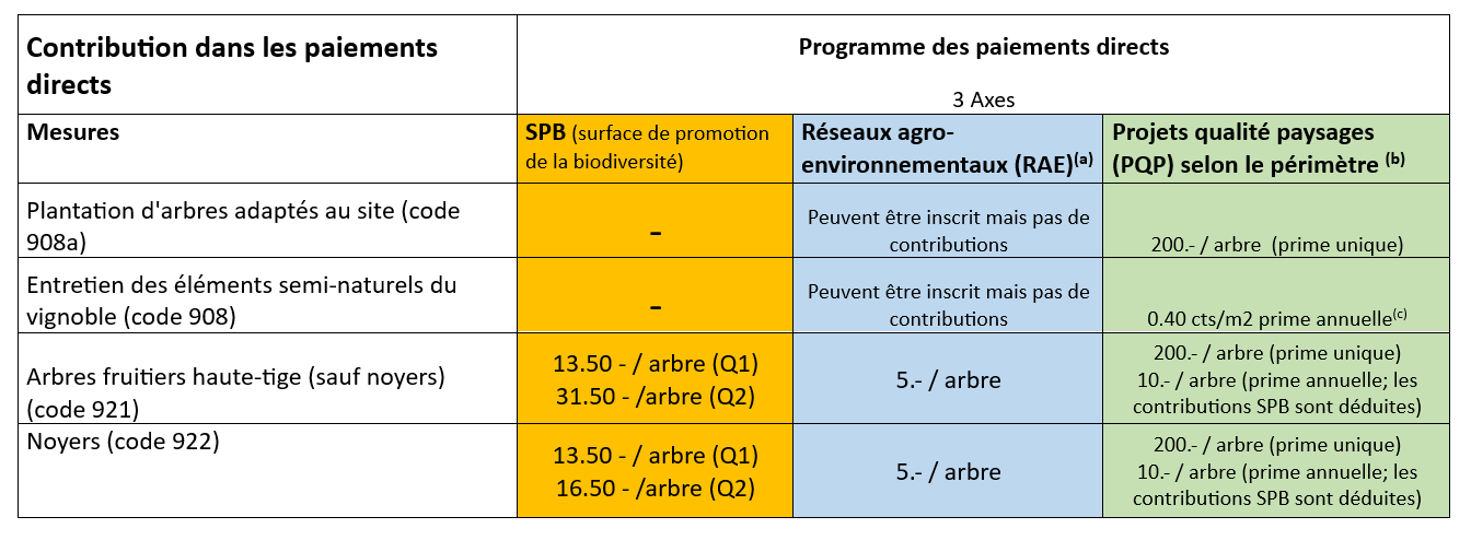 • Les SPB octroient des contributions en qualité 1 ou 2 pour les arbres fruitiers haute-tige et noyers.