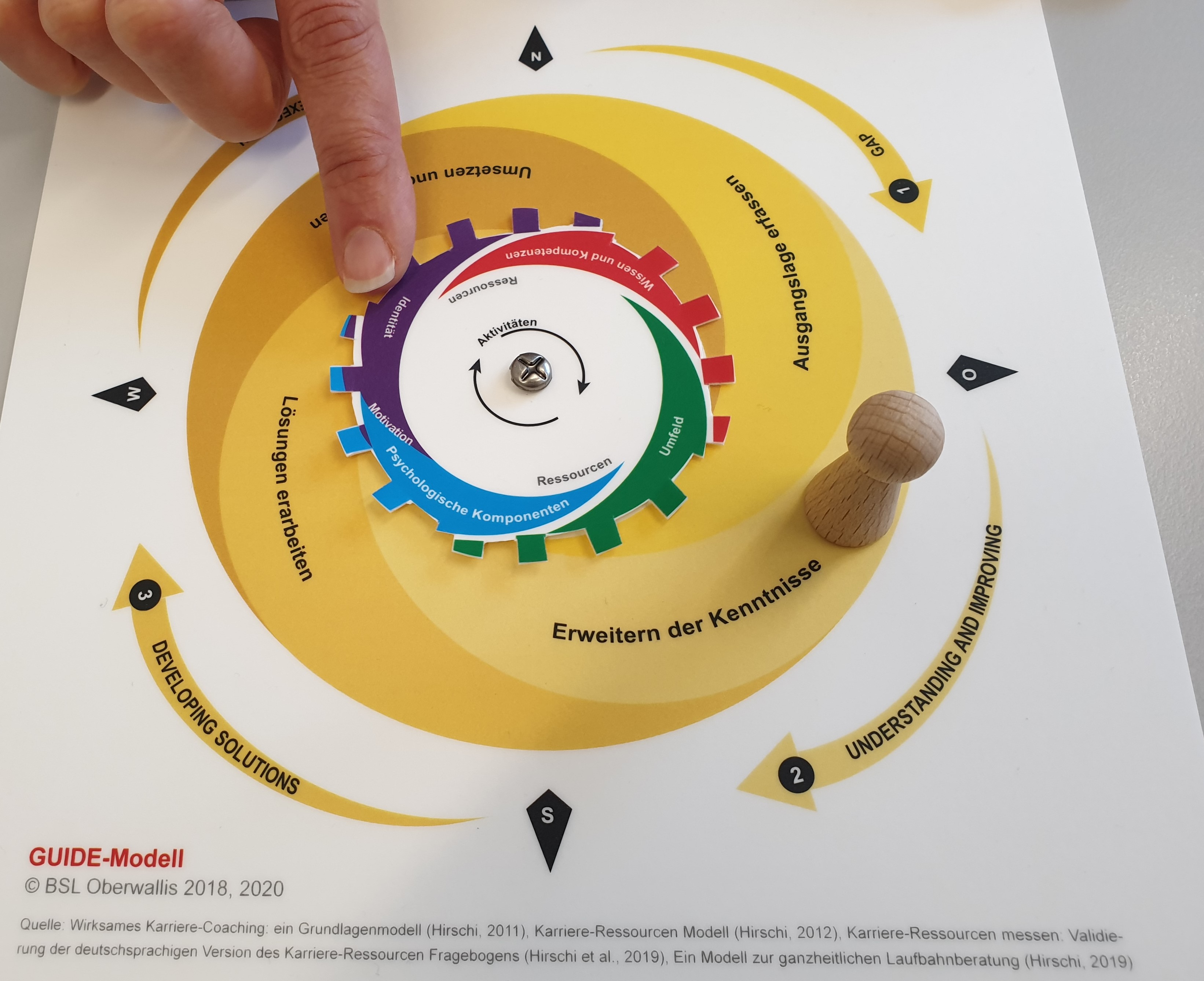 Das GUIDE-Modell eignet sich für den Einsatz in der Berufs-, Studien- und Laufbahnberatung. Es umfasst persönliche Ressourcen und Aktivitäten, welche für eine selbstbestimmte und erfolgreiche Laufbahngestaltung wichtig sind. Das Modell unterstützt die Beratungspersonen der BSL Oberwallis darin, Beratungsprozess und -inhalte klar zu strukturieren sowie an die persönlichen Bedürfnisse ihrer Kundinnen und Kunden anzupassen. Während des gesamten Beratungsprozesses bietet das GUIDE-Modell Orientierung und Transparenz.