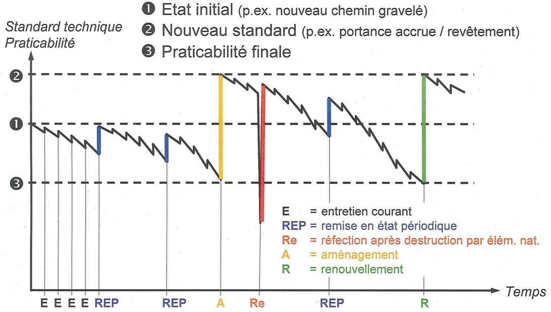 Travaux à intervalle d'au moins 8-12 ans, pour maintenir la substance et la valeur de l'ouvrage et pour garantir son bon fonctionnement à long terme.