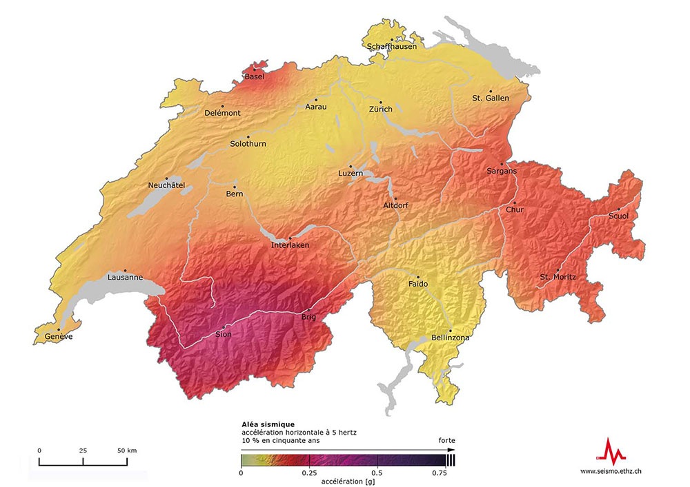Le Valais a l’aléa sismique le plus élevé de Suisse. La vallée du Rhône est classée en zone Z3b, avec des secousses d’une intensité de VIII-IX possibles, pouvant causer des dommages importants. Les régions occidentales et orientales du Valais sont en zone Z3a, où des secousses d’intensité VII-VIII peuvent causer des dommages modérés à importants. Un séisme de magnitude 6 près de Sion pourrait causer des dommages estimés entre 4,5 et 10 milliards de CHF.