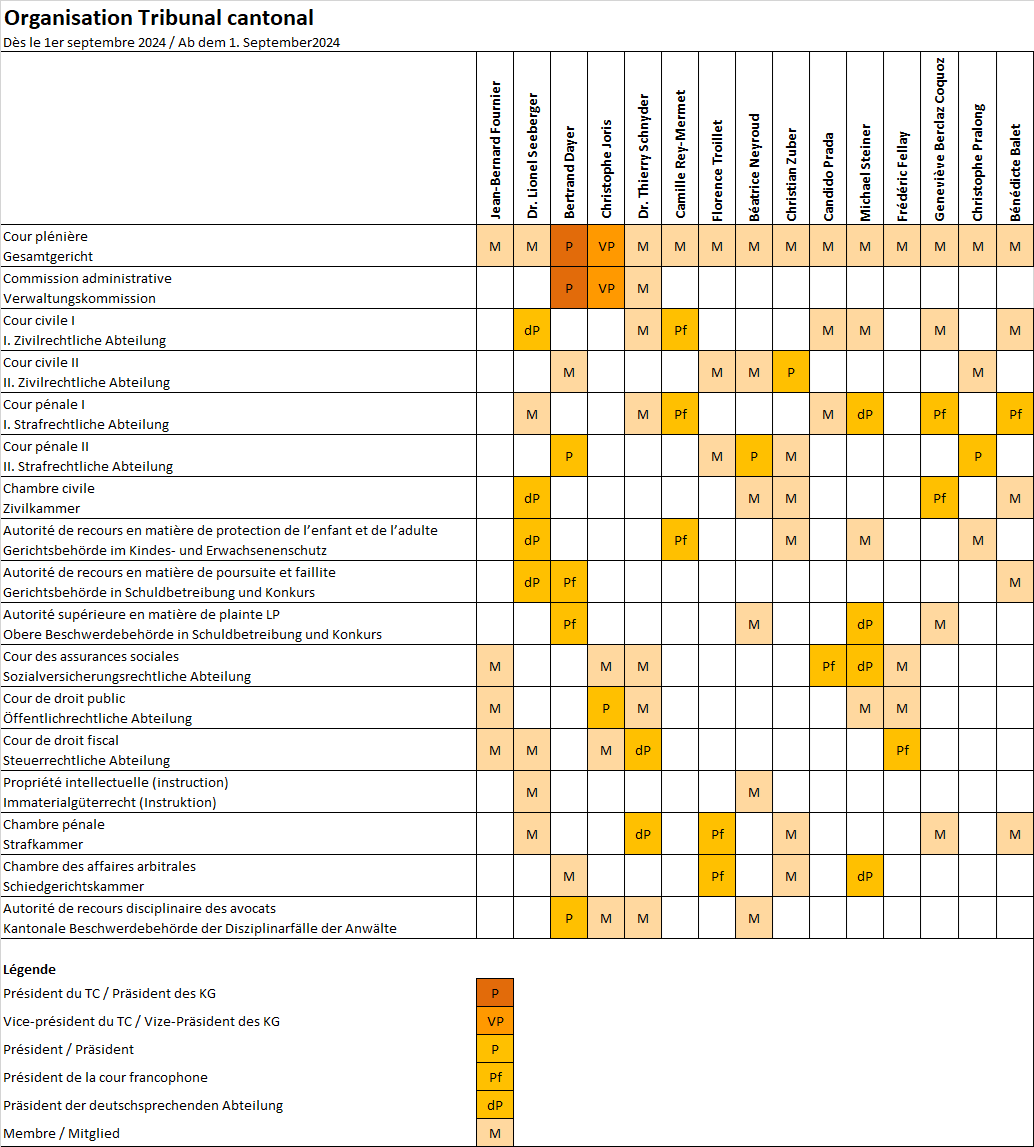 Le Tribunal cantonal désigne les membres des sections et délégations prévues par la loi ainsi que leurs présidents. Après constitution, la composition des sections et délégations est publiée au Bulletin officiel.