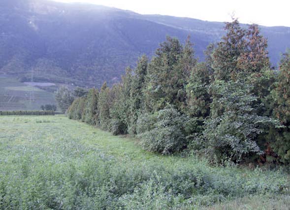 - haies hautes : d’une hauteur moyenne de 15 mètres ou plus et avec min. 3 rangées de plants et les rangs externes composés de buissons/arbustes (valeur biologique élevée, ombre et emprise plus importantes et effet coupe-vent à longue portée)