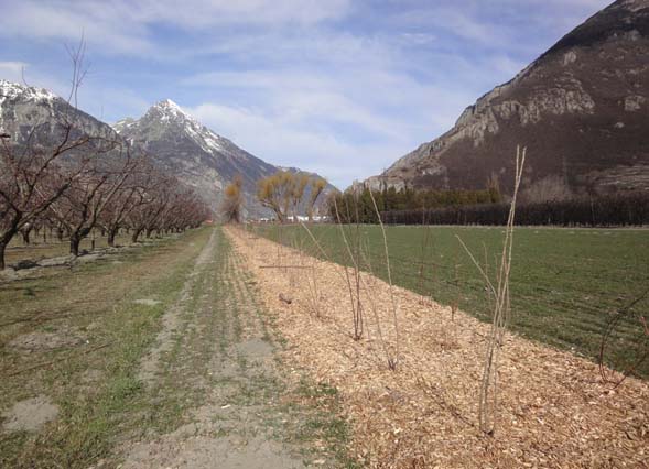 Plantation en mars 2011. La mise en place de copeaux permet de limiter les frais de fauchage et de maintenir une certaine humidité.