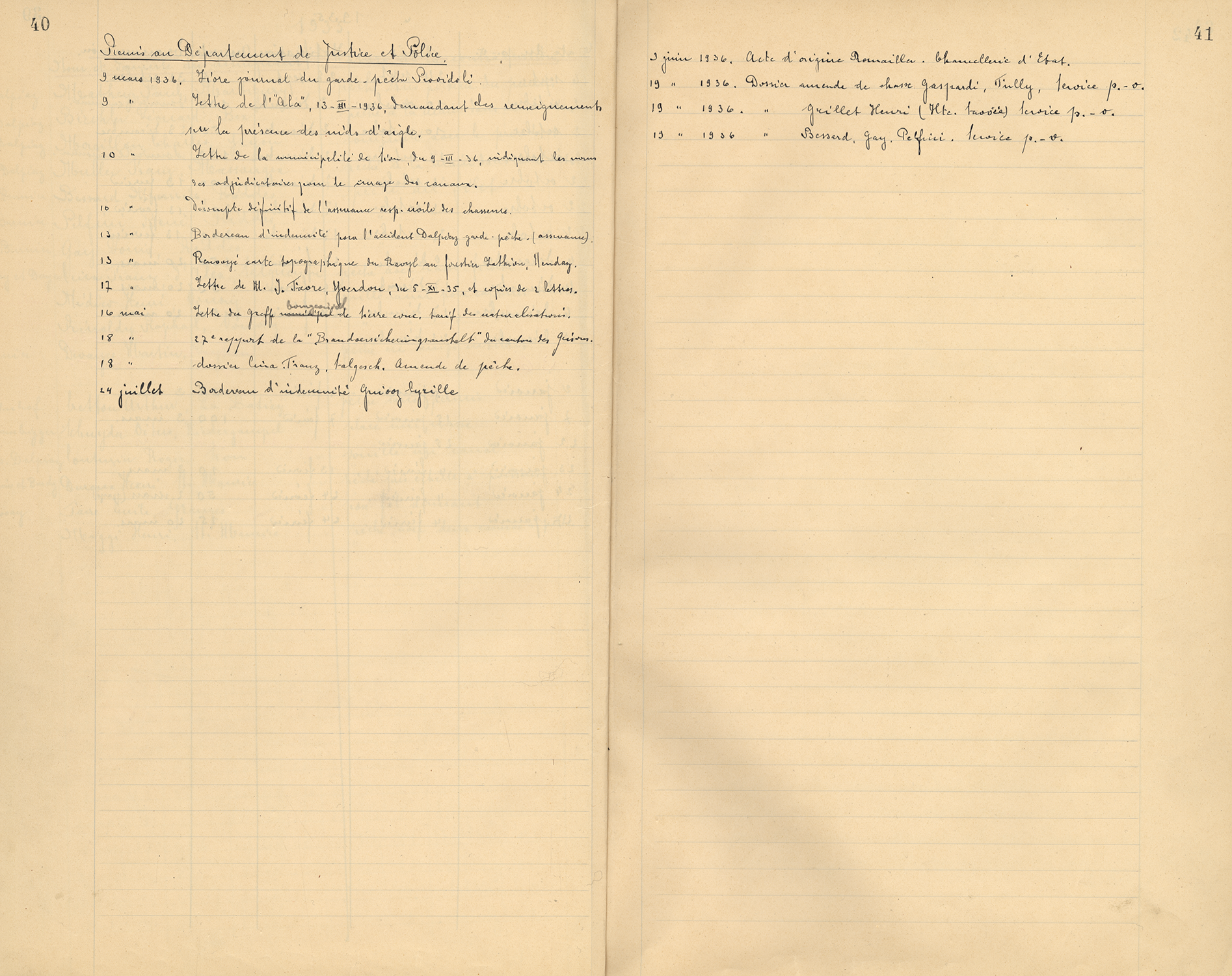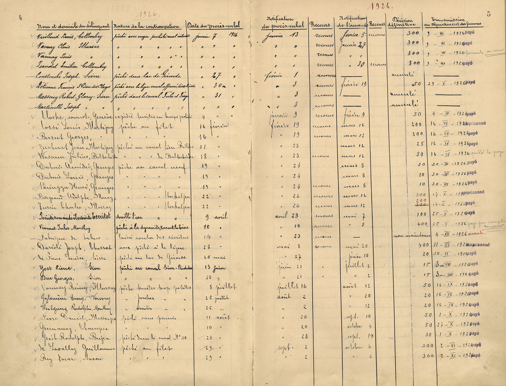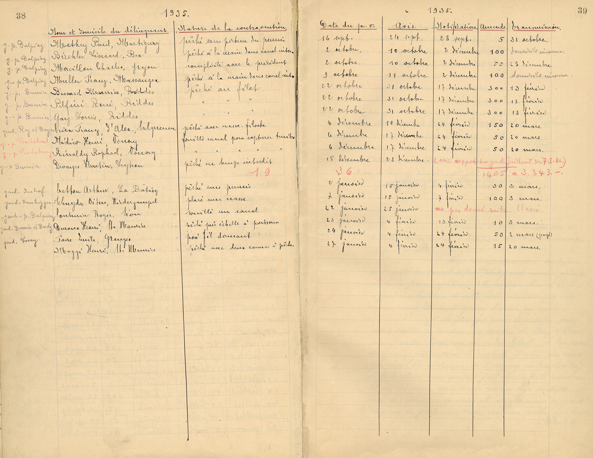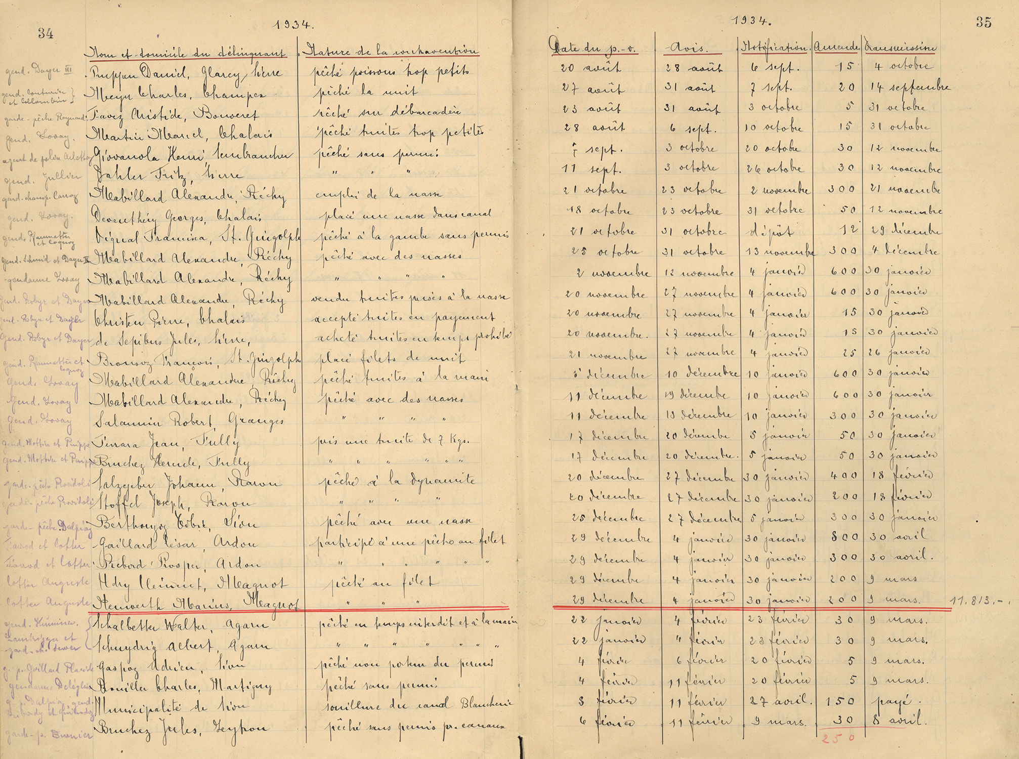 Registre des procès-verbaux, avec le nom et la provenance des personnes ayant commis un délit de pêche, avec la nature du délit et le lieu où il a été commis, 1925-1936.