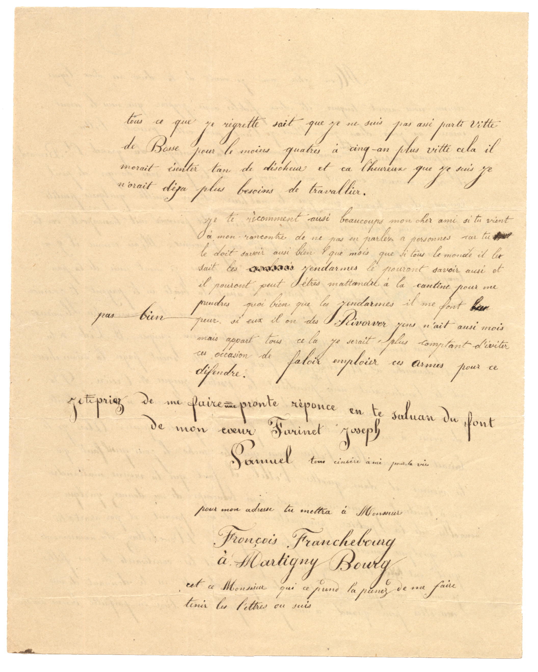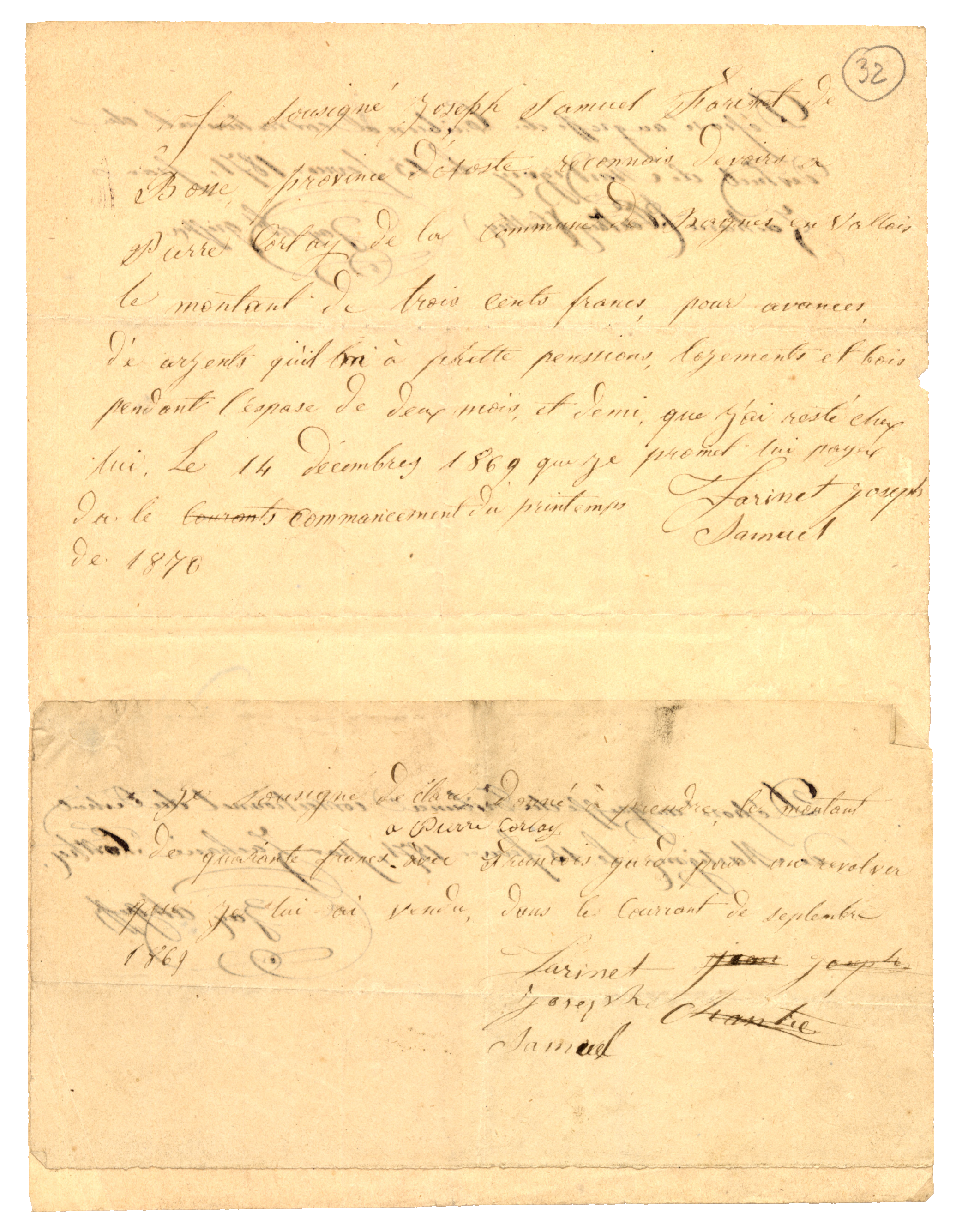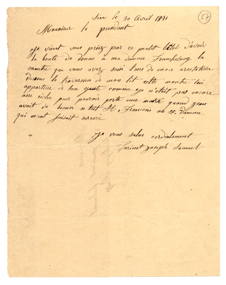Ce dossier, qui débute par le registre d'écrou, contient diverses lettres rédigées par le célèbre faux-monnayeur Joseph-Samuel Farinet (1845-1880) qui ont été produites dans le cadre de son procès.