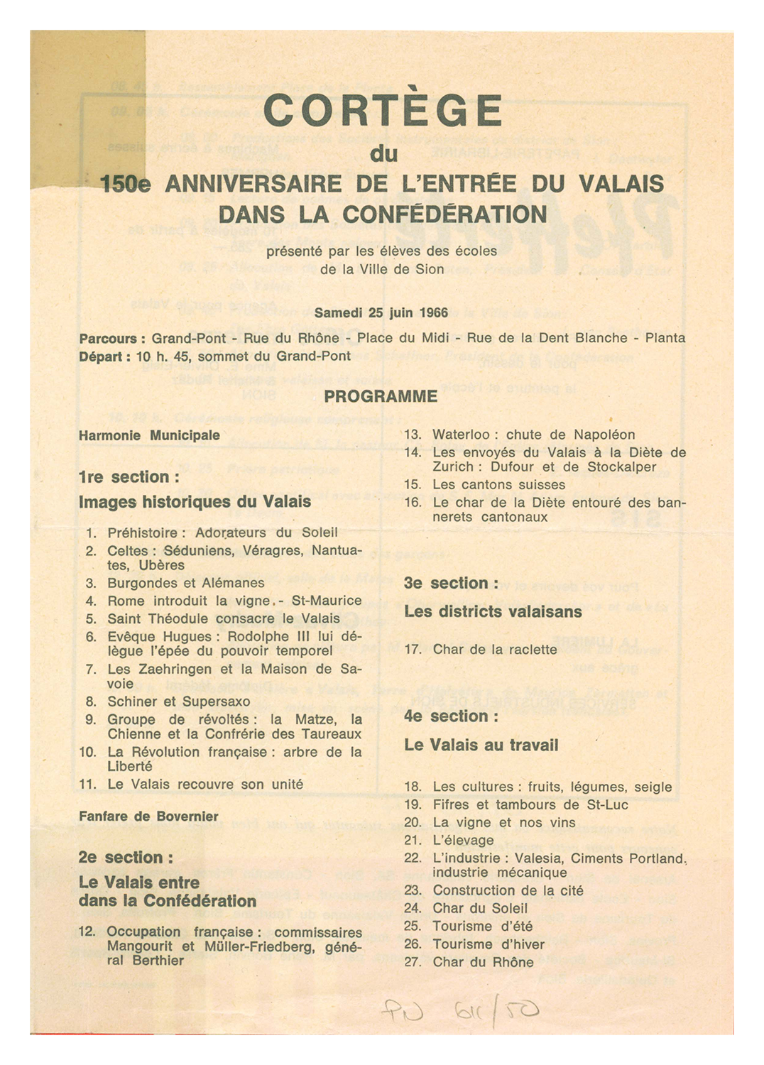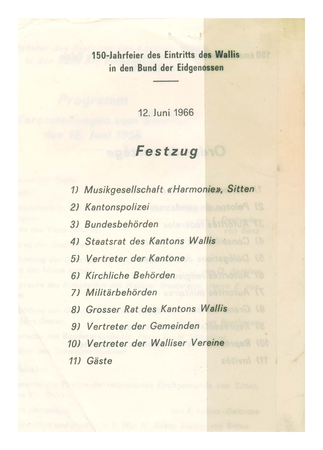 Ainsi, en 1915, on soulignait l’importance de rester unis face au danger que représentait une guerre mondiale, reléguant l’événement à l’arrière-plan ; en 1965/1966 – la catastrophe de Mattmark ayant décalé une partie des manifestations –, on mettait en parallèle le Valais d’autrefois avec la Suisse de l’époque, confrontée au même questionnement face à la nouvelle Europe qui se dessinait ; en 1990, on manifestait le désir de montrer que le Valais n’était pas uniquement le Vieux-Pays des clichés, mais qu’il était ouvert sur l’extérieur et possédait les moyens techniques et intellectuels pour aborder les défis de l’avenir.