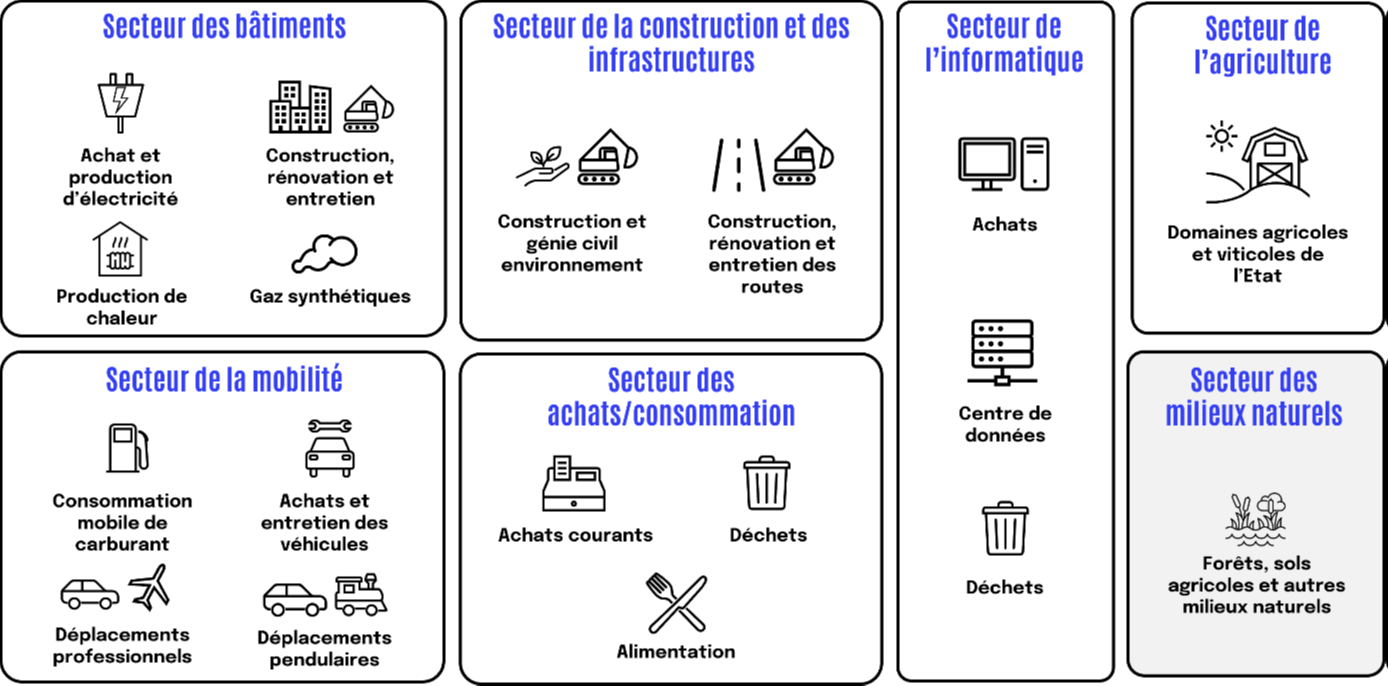 Les bilans carbone sont des étapes nécessaires pour fixer des objectifs climatiques détaillés et les mesures adéquates pour les atteindre. Un bilan carbone fait l’inventaire des émissions de gaz à effet de serre ⓘ dans un périmètre défini (par exemple une entreprise, une commune, un canton).