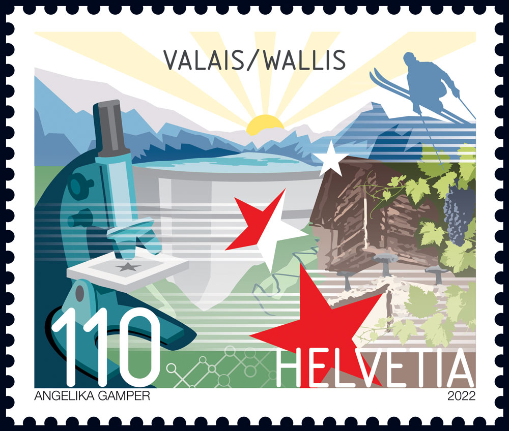 Le timbre-poste du canton du Valais se veut une invitation à un voyage entre innovation et tradition. Il met en avant le potentiel énergétique du Valais avec ses barrages et son ensoleillement. Le microscope illustre une économie dynamique, tournée vers des start-up à forte valeur ajoutée et un socle industriel solide.