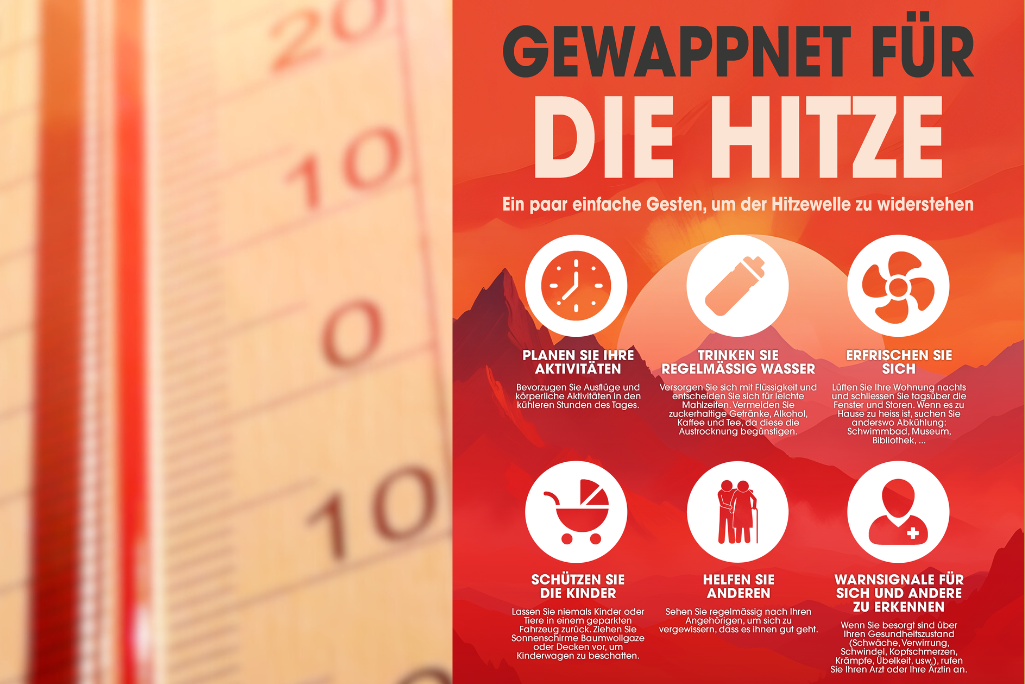 Aufgrund dieser Informationen weisen wir darauf hin, dass diese Wetterbedingungen ernsthafte Auswirkungen auf die Gesundheit der Menschen haben können: Dehydrierung, Erschöpfung, Ohnmacht, Hitzschlag. Die Gefahr ist besonders gross für gefährdete Personen wie ältere Menschen, Kleinkinder, Schwangere, chronisch Kranke oder Personen, die im Freien arbeiten.