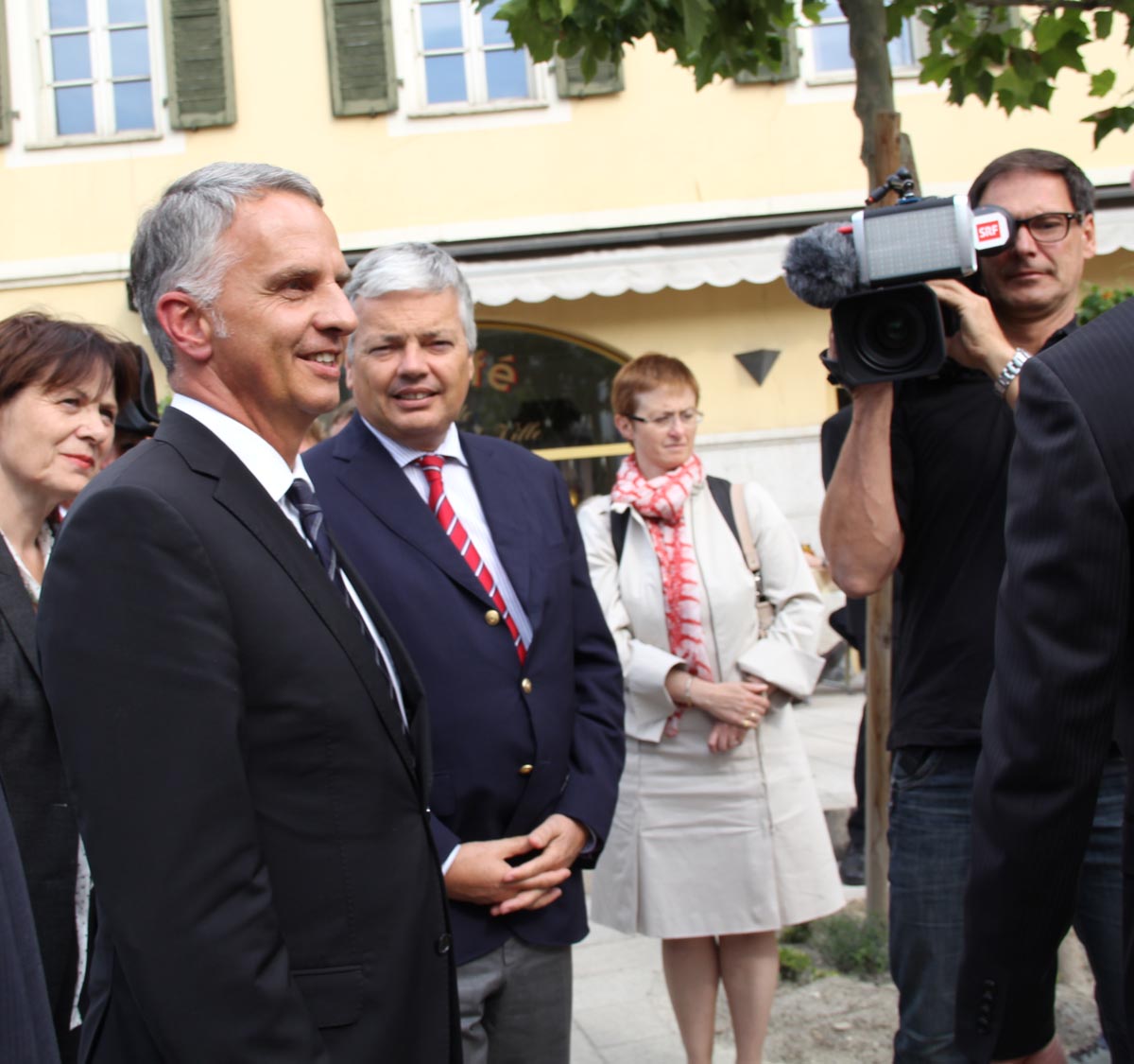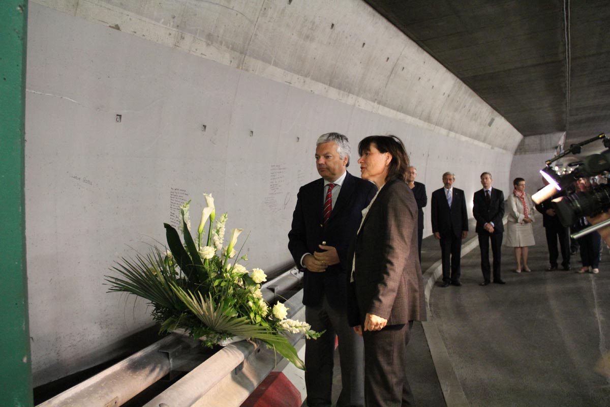 (IVS).- Didier Reynders, vice-premier ministre de Belgique, ministre des affaires étrangères, du commerce extérieur et des affaires européennes, s’est rendu lundi à Sierre. Il s’est recueilli dans le tunnel de l’A9 sur le lieu de l’accident d’autocar du 13 mars 2012. Il a témoigné ensuite, à l’Hôtel de Ville, la reconnaissance de son pays à la Suisse et au Valais. La présidente du Gouvernement valaisan Esther Waeber-Kalbermatten, le conseiller d’Etat Jacques Melly, le président de Sierre François Genoud et des représentants des sauveteurs ont assisté à la cérémonie, en présence du conseiller fédéral Didier Burkhalter