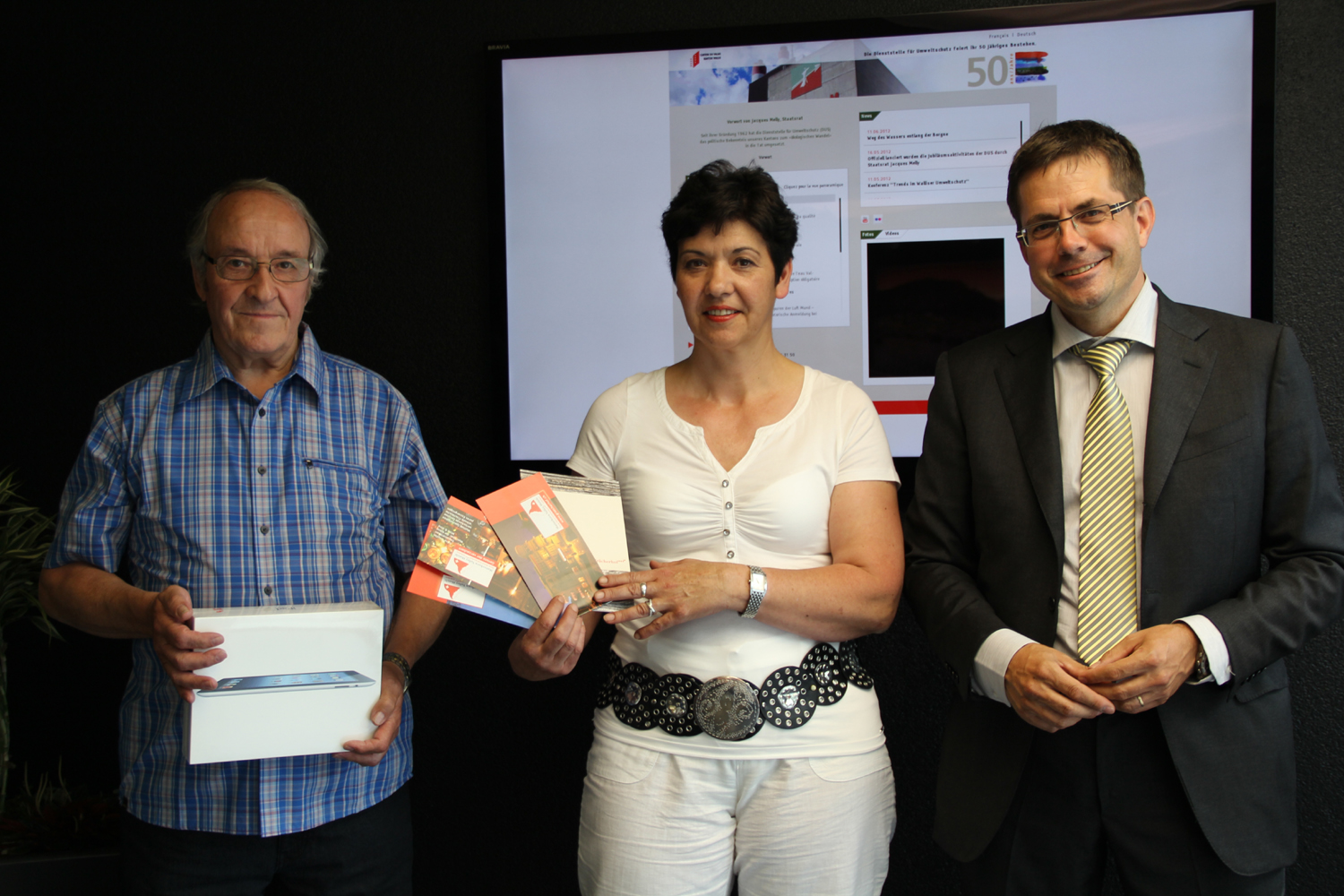 (IVS).- Dans le cadre de son 50e anniversaire, le Service de la protection de l’environnement a participé à l’édition 2012 de la Vifra sur le stand de la Marque Valais. Les prix d’un concours qui a rassemblé 431 personnes ont été remis hier à Viège. Les trois gagnants ont remporté un i-Pad 4G, un séjour dans un hôtel de Grächen ainsi qu’un assortiment de produits de la Marque Valais.