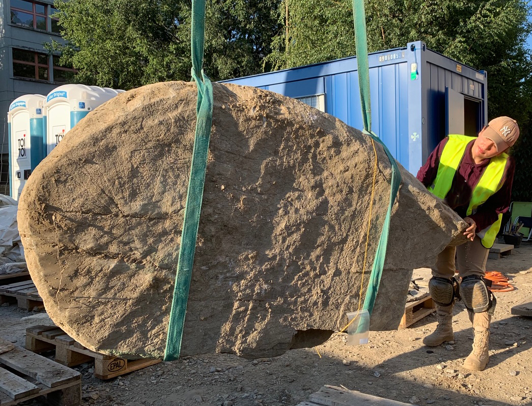 Fig. 4. Prélèvement de la seconde stèle anthropomorphe au motif solaire par la responsable du chantier Ioana Benazeth (ARIA SA). © SBMA - ARIA SA.