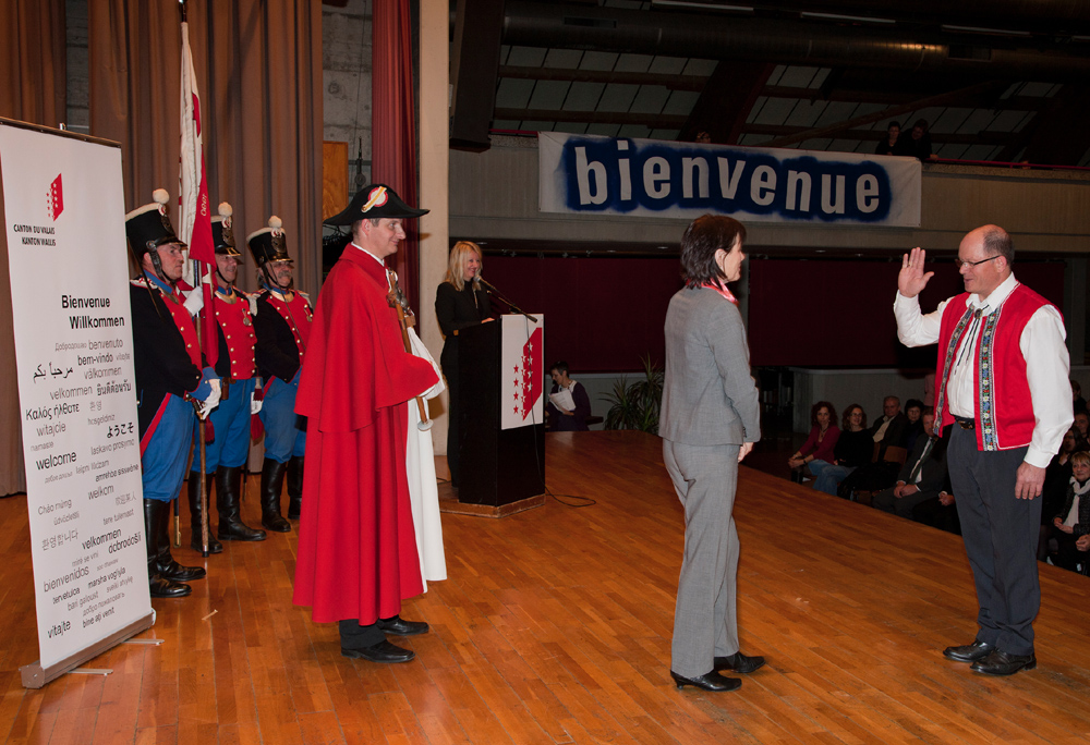 (IVS).- Le Valais compte 938 nouveaux citoyennes et citoyens. La conseillère d’Etat Esther Waeber-Kalbermatten, cheffe du Département de la sécurité, des affaires sociales et de l’intégration, a présidé lundi deux cérémonies d’assermentation de nouveaux citoyens. Assistée par Monique Albrecht, vice-chancelière d’Etat, elle a officiellement naturalisé 547 personnes à Conthey et 391 à Viège.