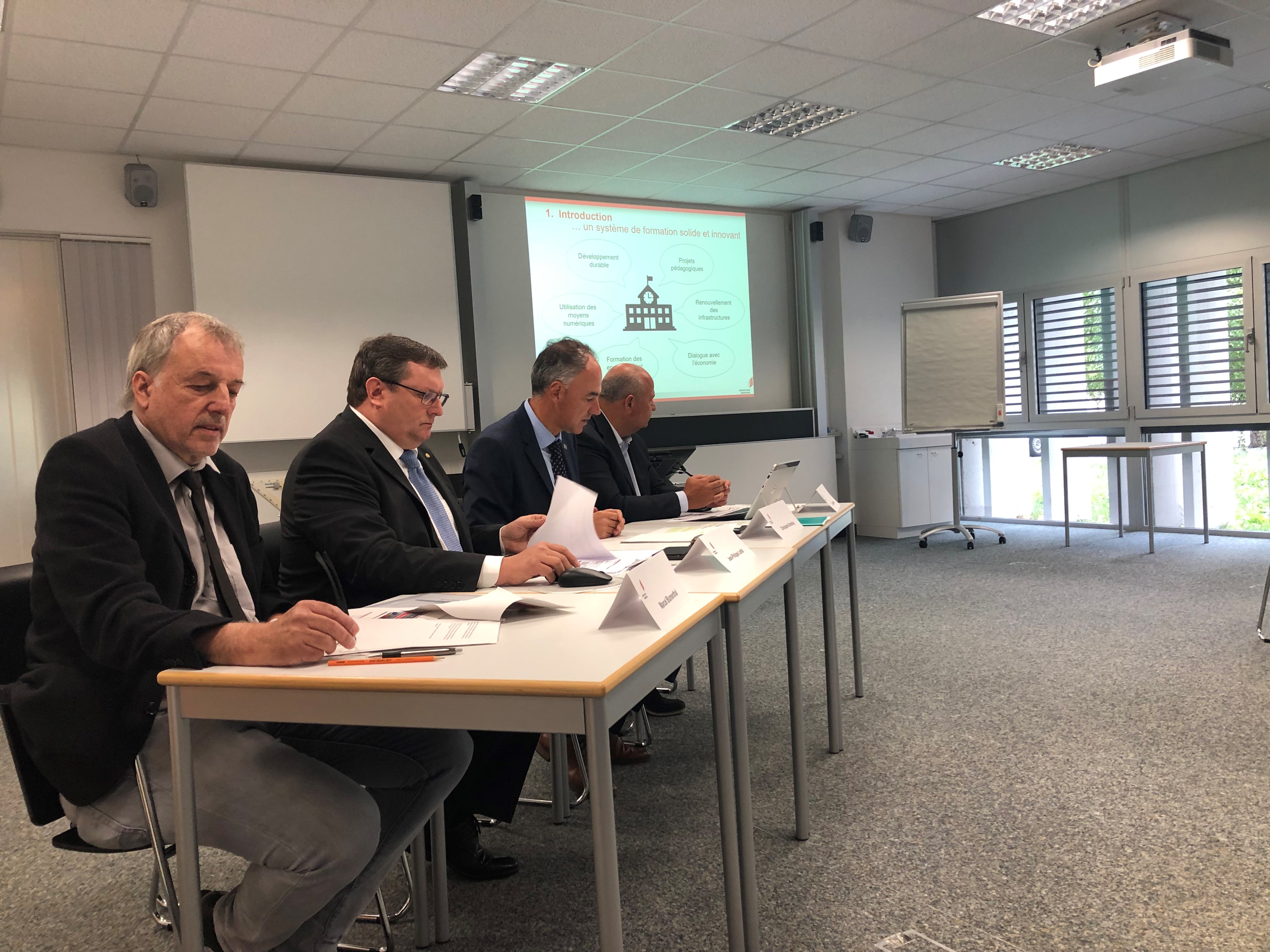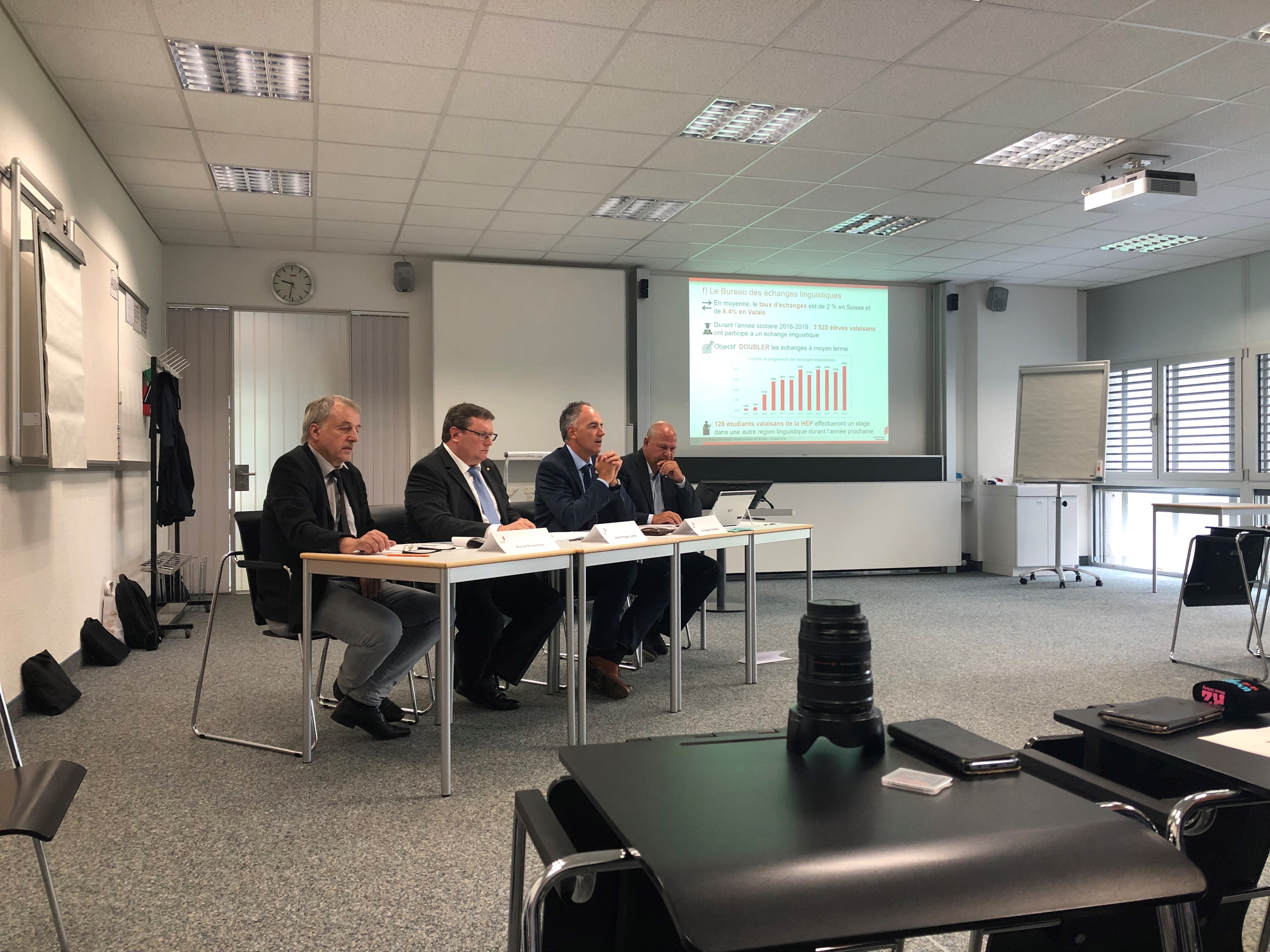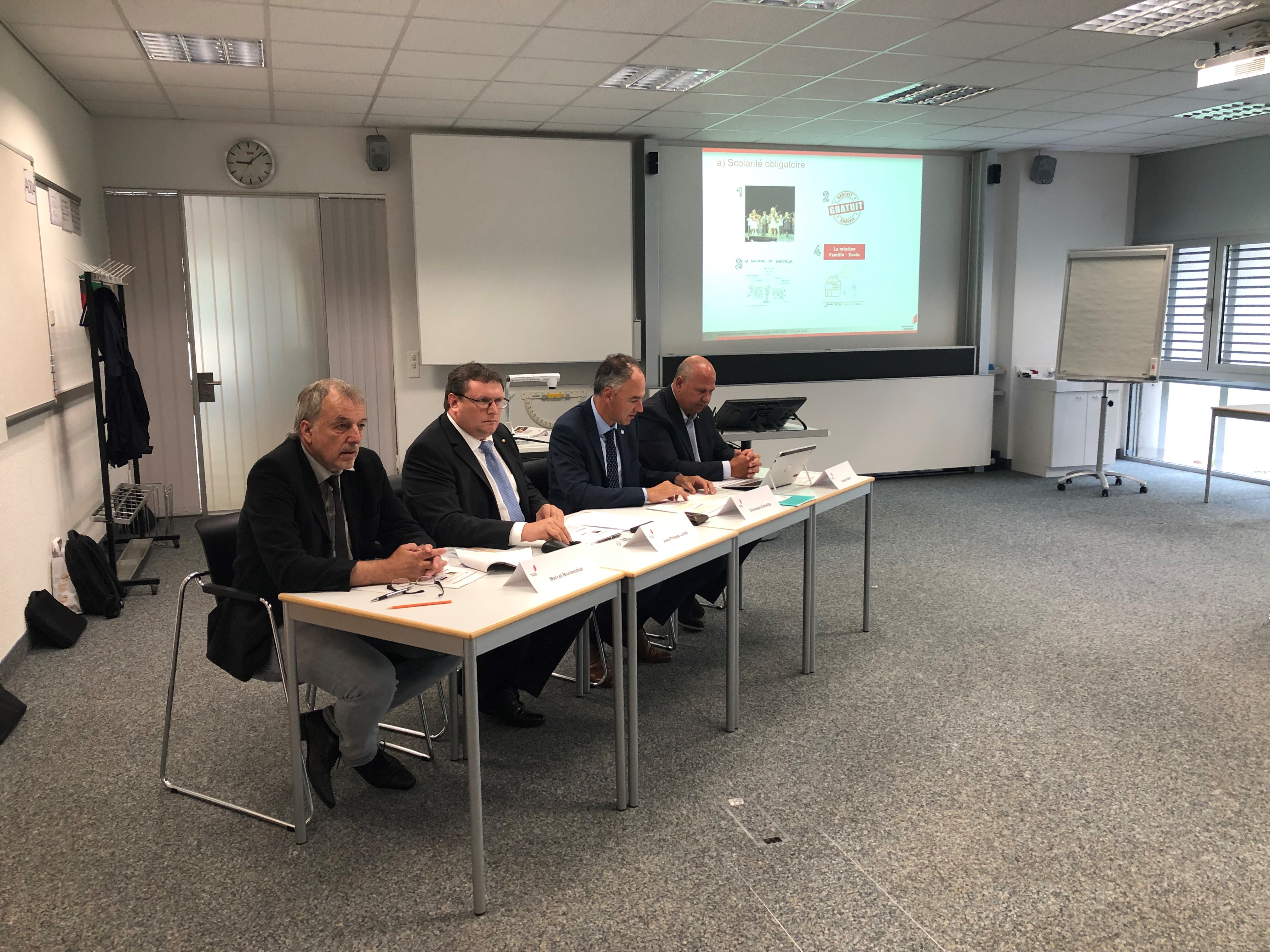 Marcel Blumenthal, adjoint du Service de l’enseignement – Jean-Philippe Lonfat, chef du Service de l’enseignement – Christophe Darbellay, chef du Département de l’économie et de la formation – Claude Pottier, chef du Service de la formation professionnelle.
