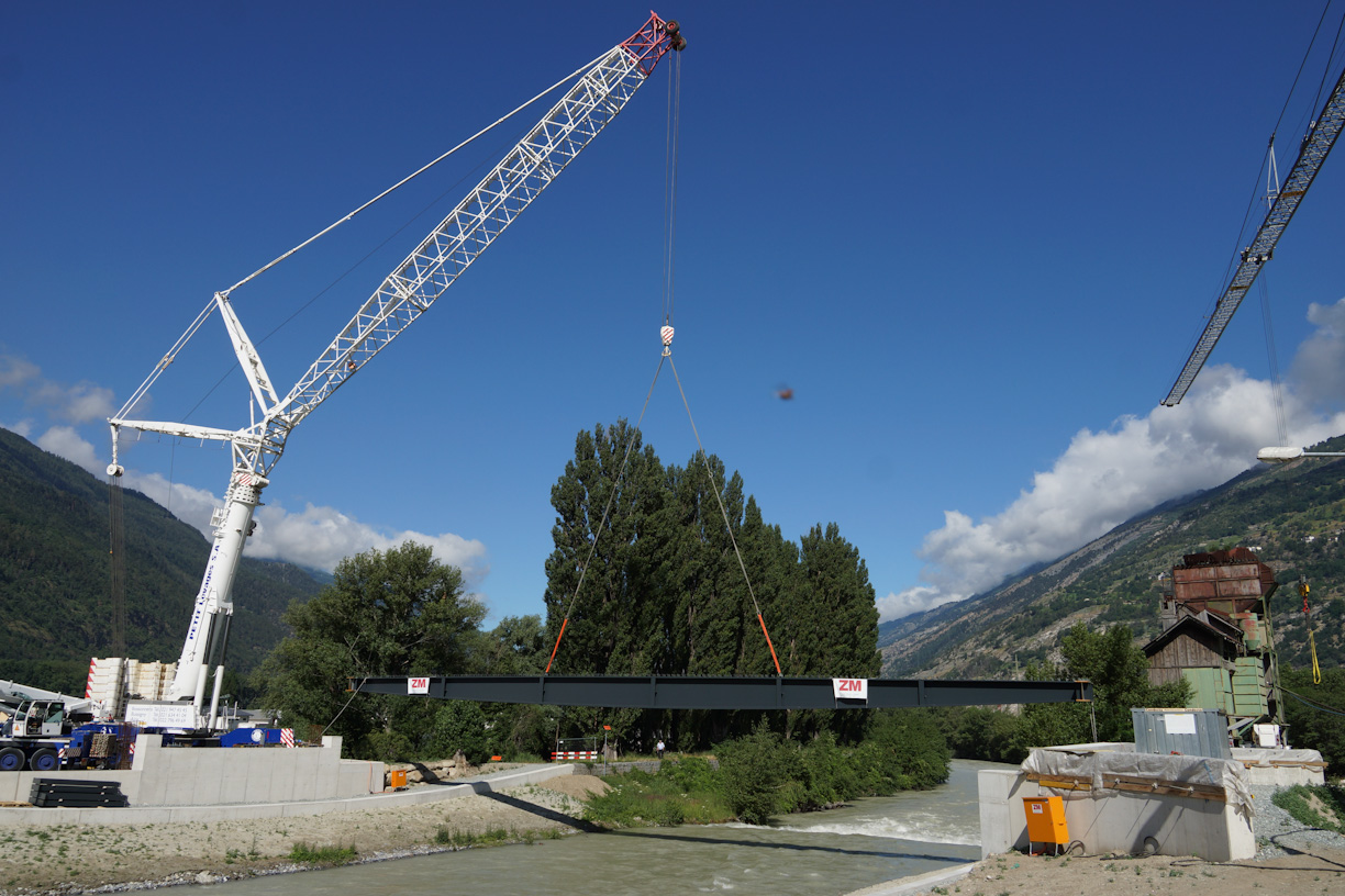 (IVS).- La plus grande grue mobile de Suisse a déplacé mercredi et jeudi trois poutres de 44 tonnes chacune et d’une longueur de 44 mètres. Ces éléments constitueront l’armature d’un pont routier sur la Vispa, qui permettra de décharger Viège du trafic industriel. Cet ouvrage complétera un autre pont à construire, lequel raccordera les villages de la rive droite du Rhône (Baltschieder, Ausserberg, Eggerberg, Lalden) à la future autoroute A9.
