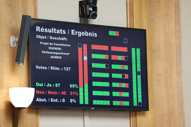 Zwischen September und Dezember 2021 hat der Verfassungsrat an zehn Plenarsessionen getagt, um den von den thematischen Kommissionen im Frühjahr 2021 erarbeiteten Vorentwurf für die erste Lesung zu behandeln. Im Rahmen dieser ersten Lesung wurden über 500 Abstimmungen zu den von den politischen Fraktionen und Mitgliedern des Verfassungsrates eingereichten Abänderungsanträgen durchgeführt. Der aus der ersten Lesung im Plenum des Verfassungsrates resultierende Verfassungsvorentwurf wurde anschliessend durch zwei Experten für Verfassungsrecht geprüft, die ihren Bericht im Februar 2022 übermittelt haben.