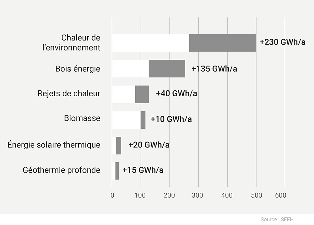 Pour la production de chaleur et de carburant indigène ainsi que pour la valorisation des rejets thermiques, les objectifs de production d’énergie supplémentaire entre 2019 et 2035 sont les suivants :
