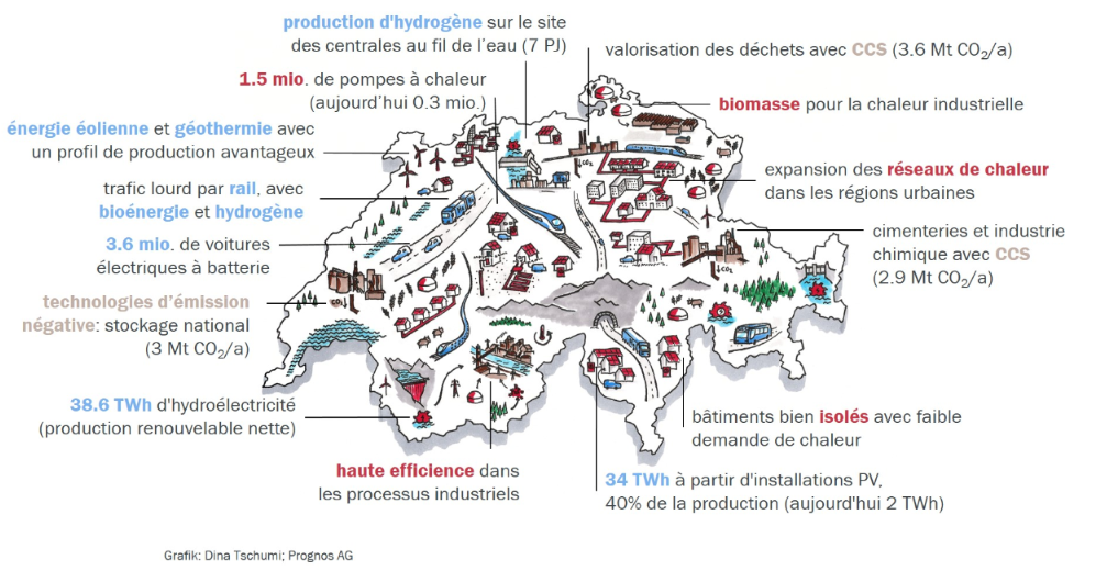 Avec les Perspectives énergétiques 2050+, publiées en automne 2020, l'Office fédéral de l’energie (OFEN) montre notamment dans le scénario suivant comment les objectifs de neutralité climatique pourraient être mis en œuvre d'ici 2050 :