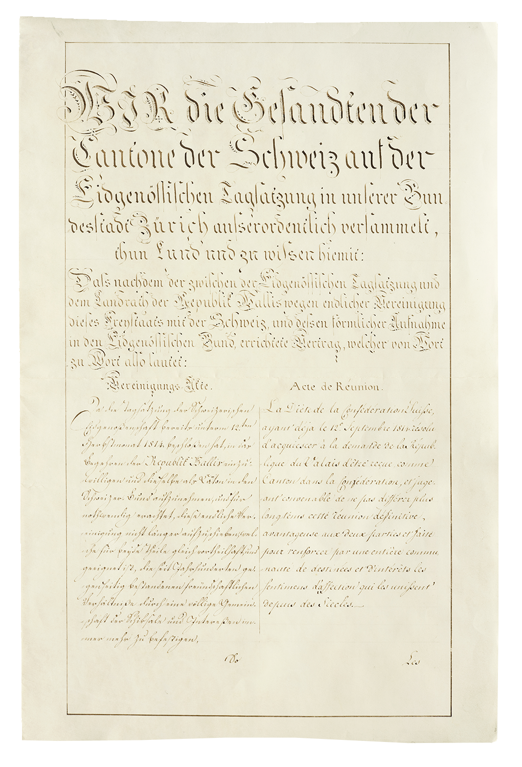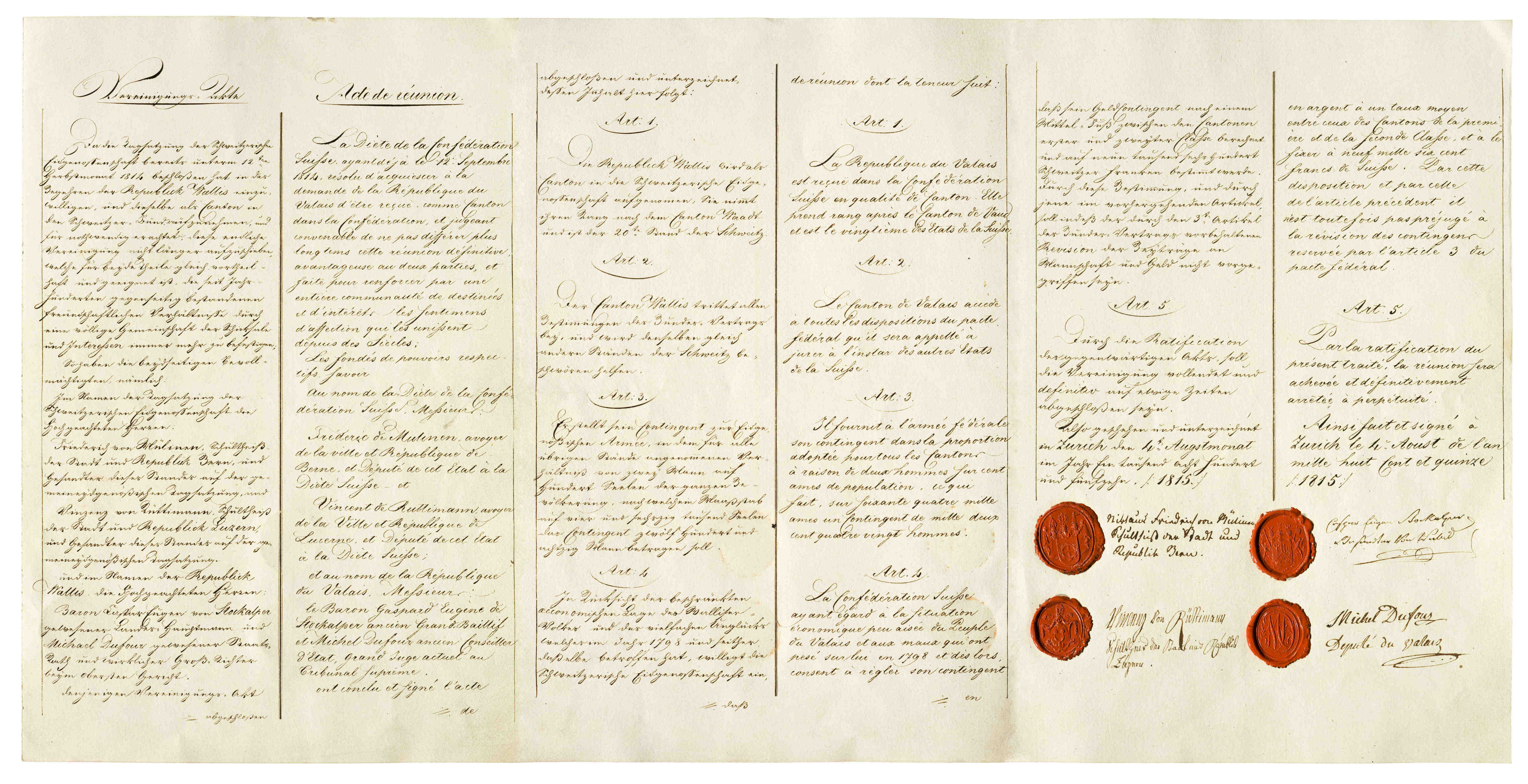 La Diète de la Confédération suisse, ayant déjà le 12e septembre 1814 résolu d'acquiescer à la demande de la République du Valais d'être reçue comme Canton dans la Confédération et jugeant convenable de ne pas différer plus longtems cette réunion définitive, avantageuse au deux parties et faite pour renforcer par une entière communauté de destinées et d'intérêts les sentimens d'affection qui les unissent depuis des siècles;