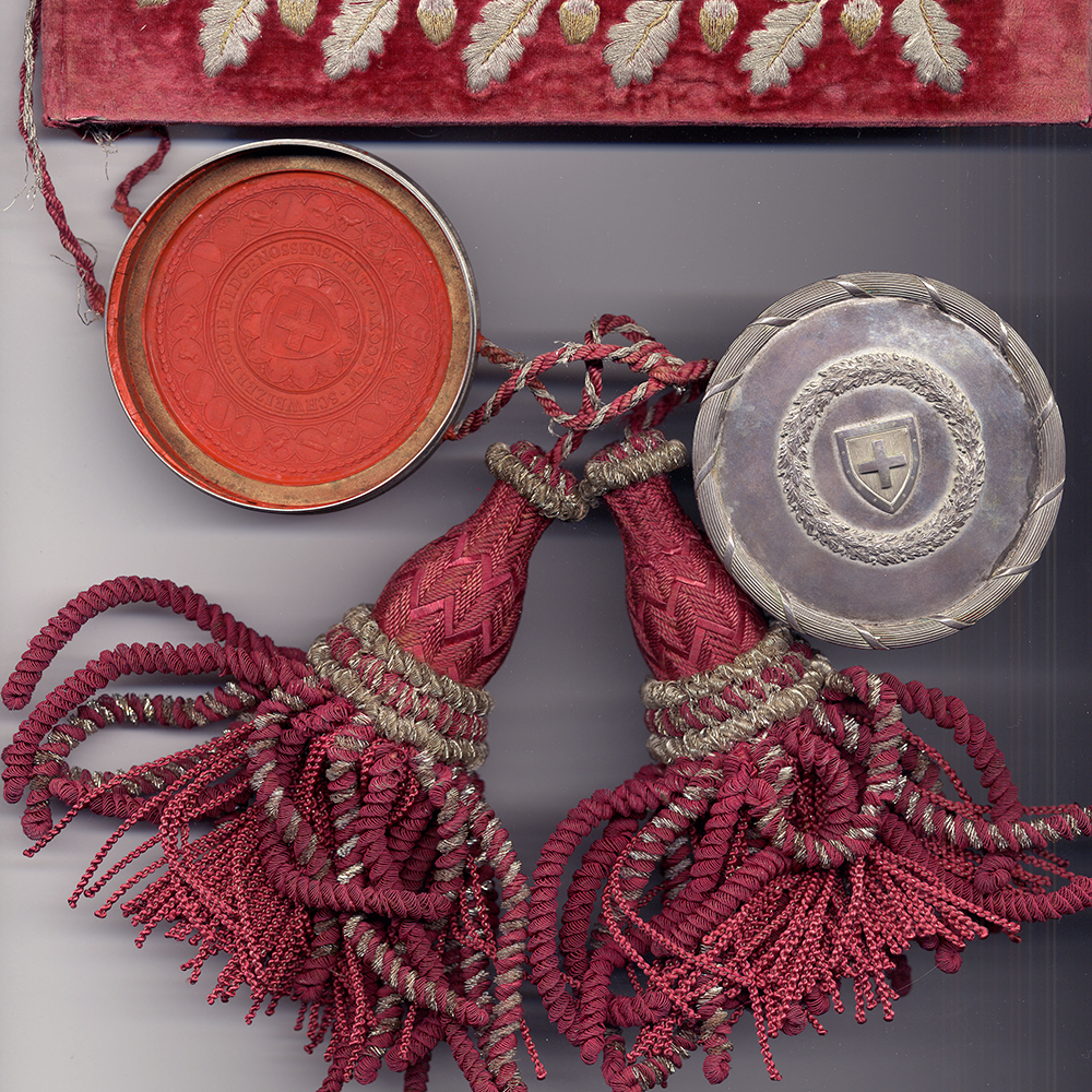 Description : Papier, bi-feuillet, 25x37.5 cm; texte français et allemand; sceau plaqué sous papier de la Confédération suisse.