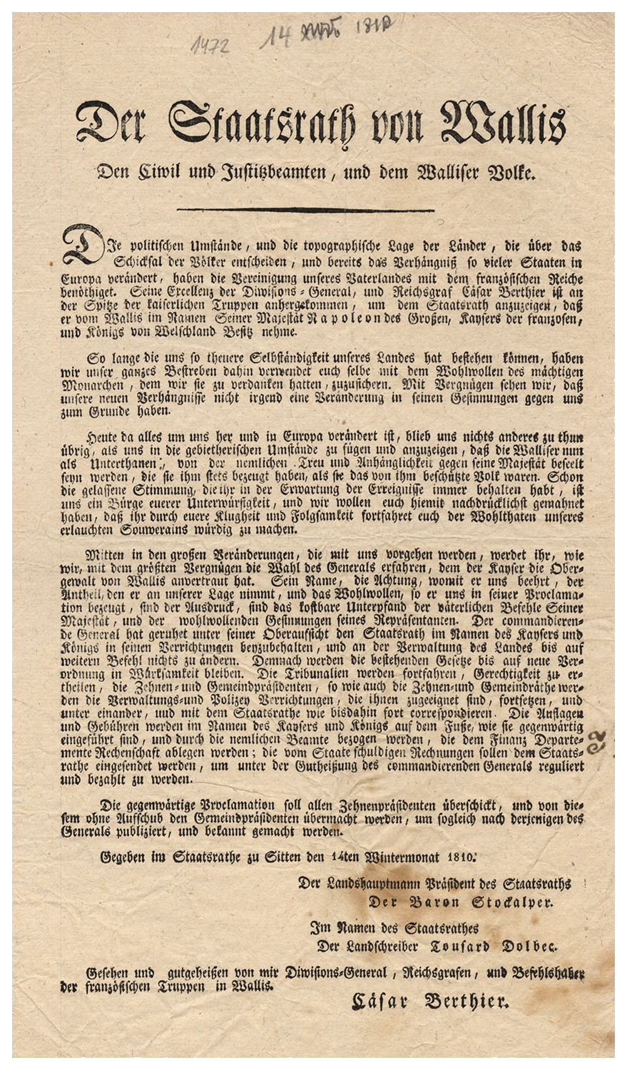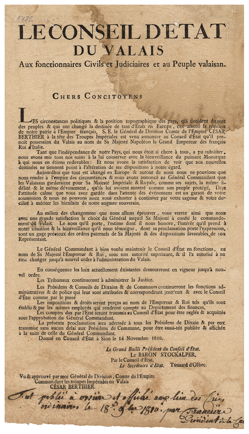 Avec l’aval du général César Berthier, commandant des troupes impériales en Valais, le Conseil d'Etat s'adresse aux fonctionnaires civils et judiciaires et au Peuple valaisan, afin de les assurer de la volonté de "ne rien changer jusqu’à nouvel ordre à l’administration du Valais". Les placards sont destinés à être affichés et publiés dans les communes.