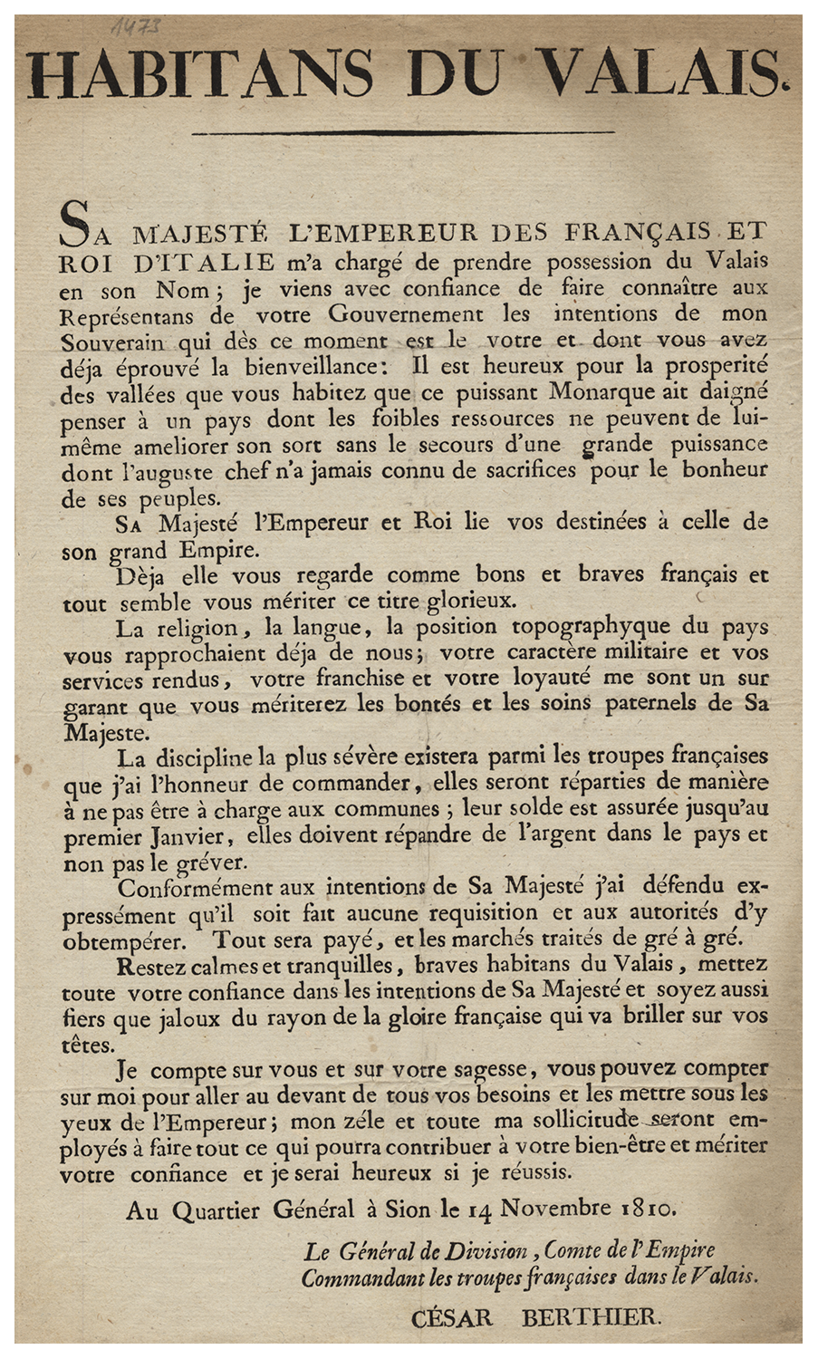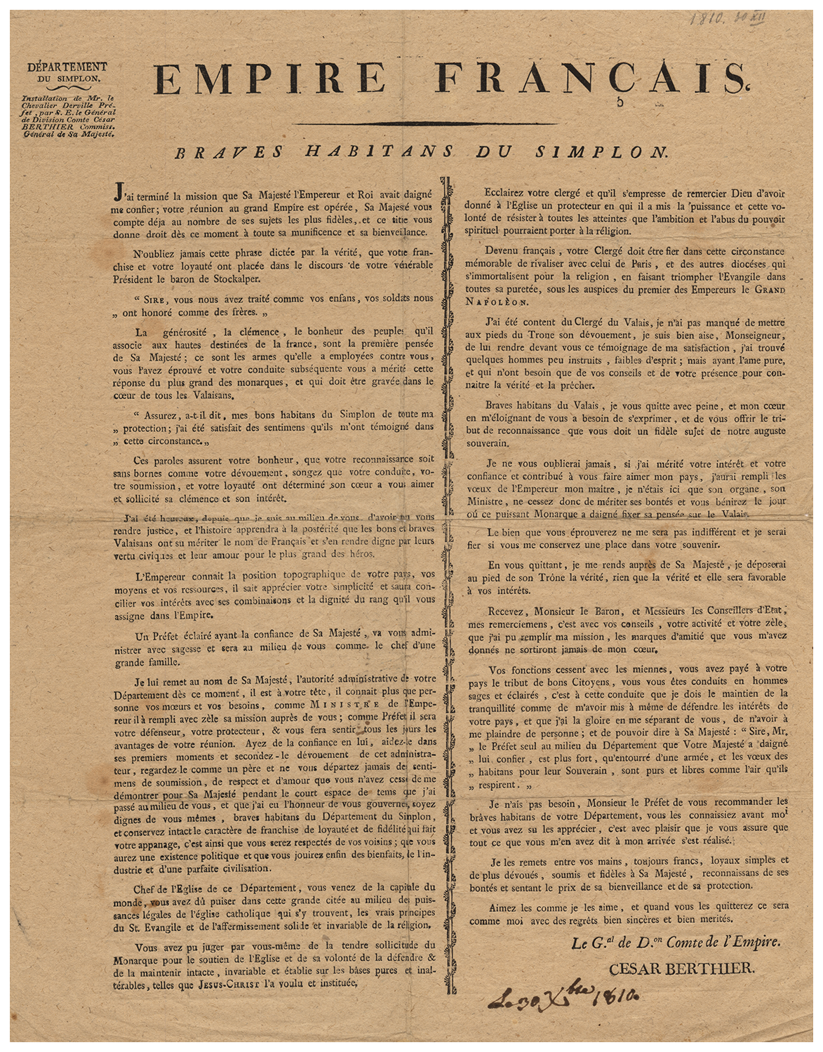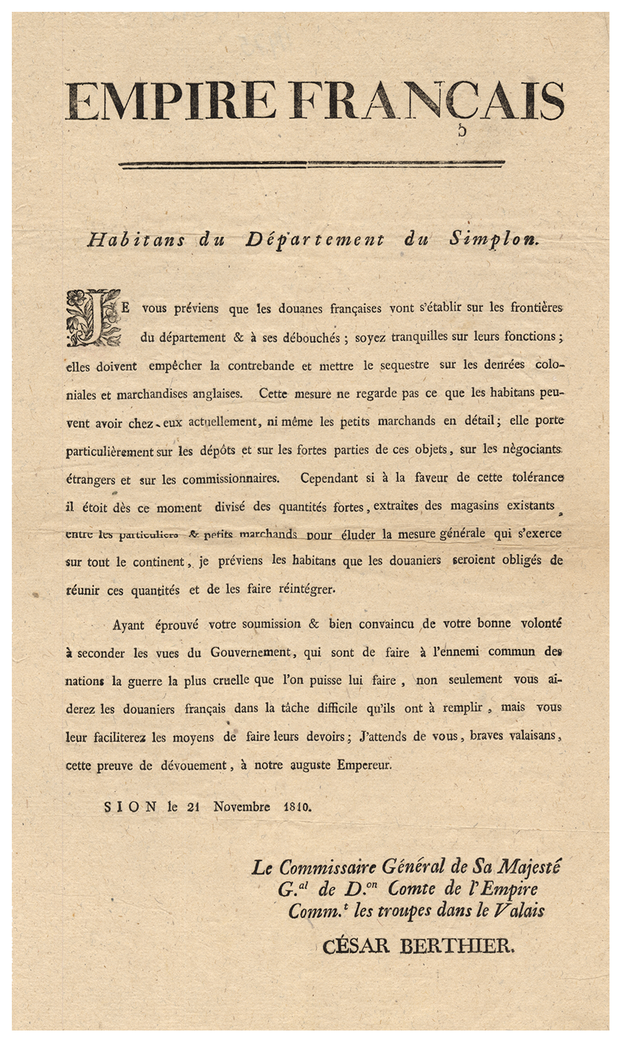 César Berthier s'adresse aux habitants du Valais pour leur signifier la prise de possession du Valais par l'Empereur Napoléon Ier. Cet exemplaire du placard porte une annotation manuscrite du lieu et de la date de publication: Orsières, le 18 novembre 1810, par Franière, président de la Commune.